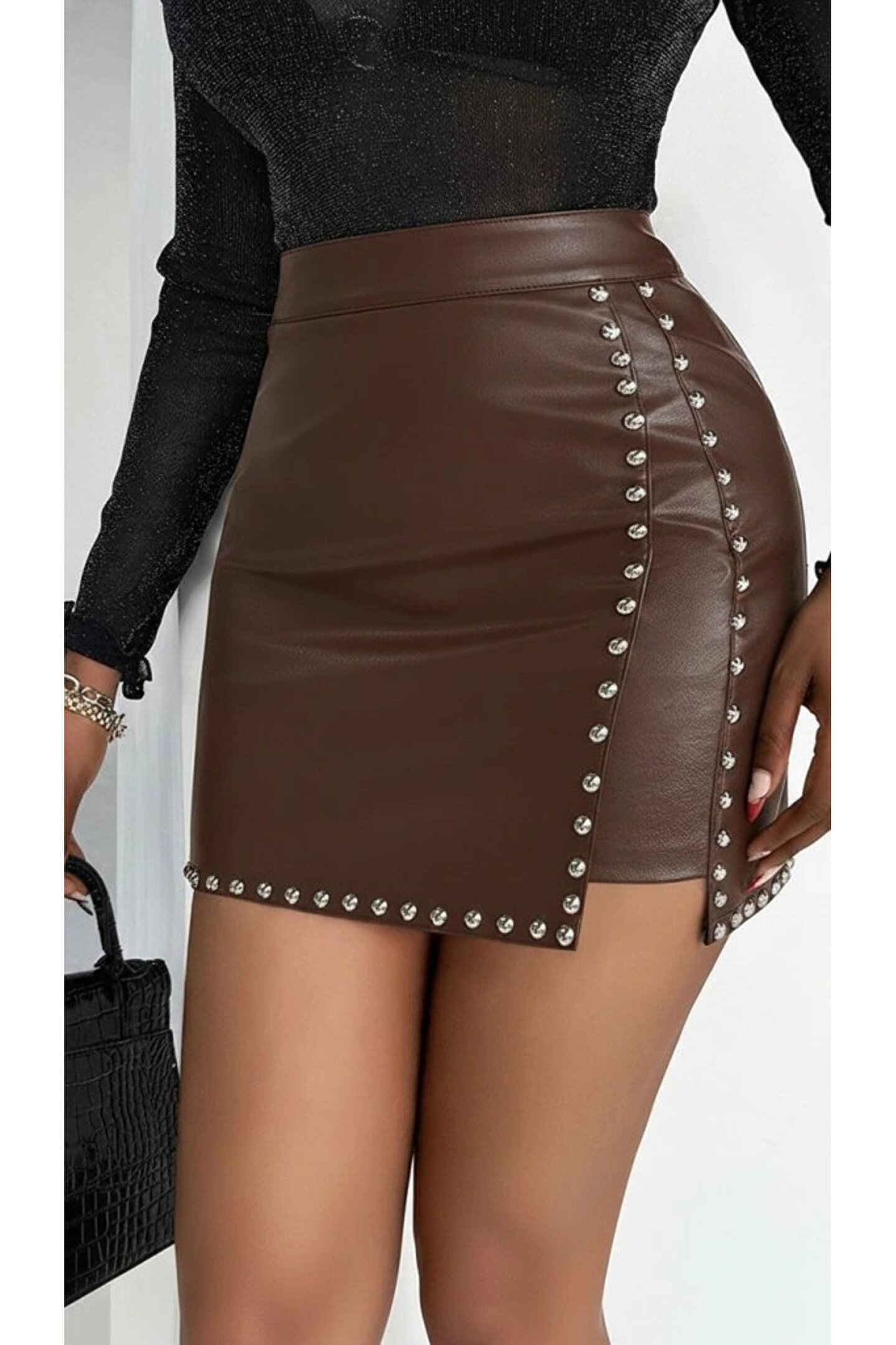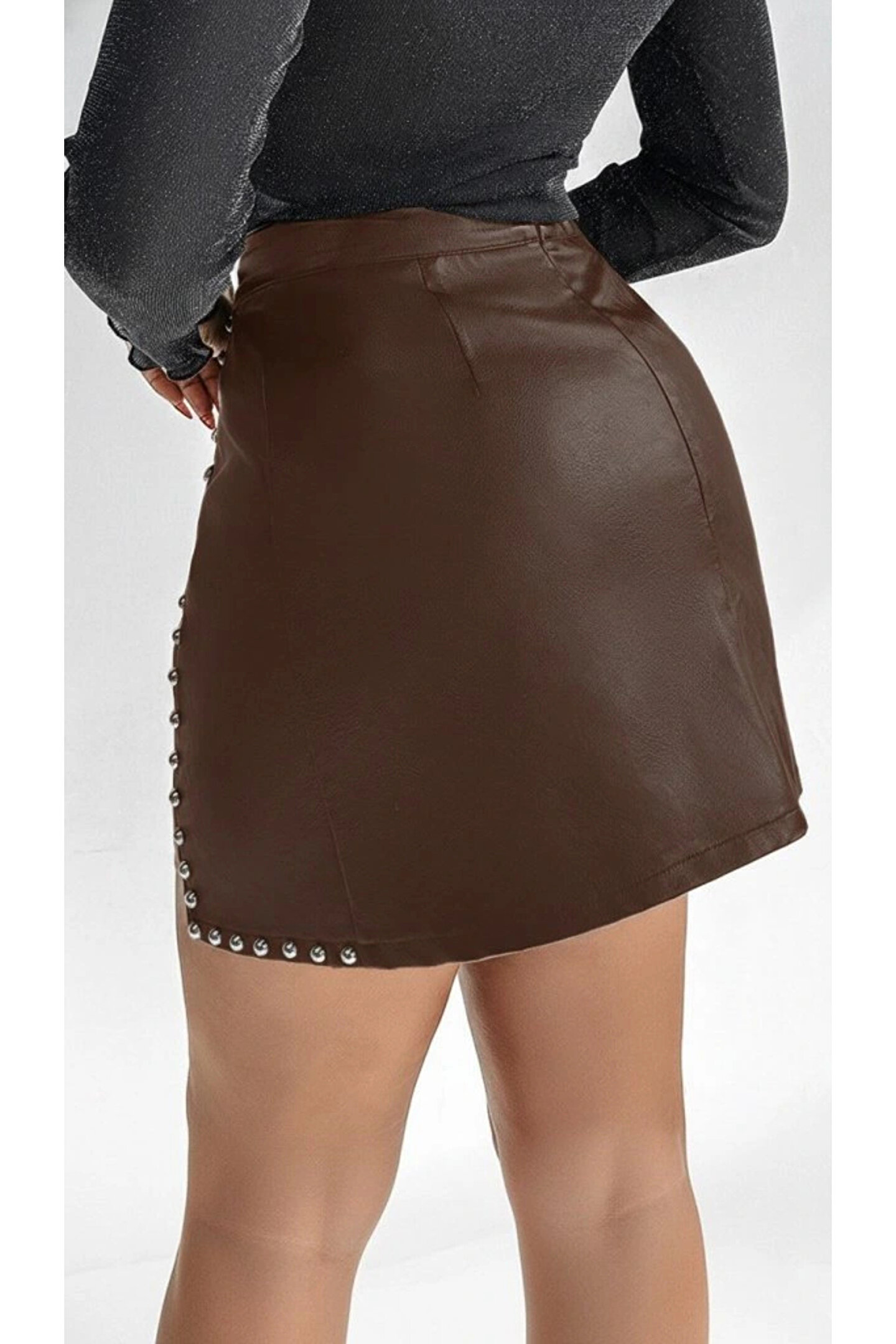 Kadın Yüksek Belli Yandan çivili Mini Deri Etek