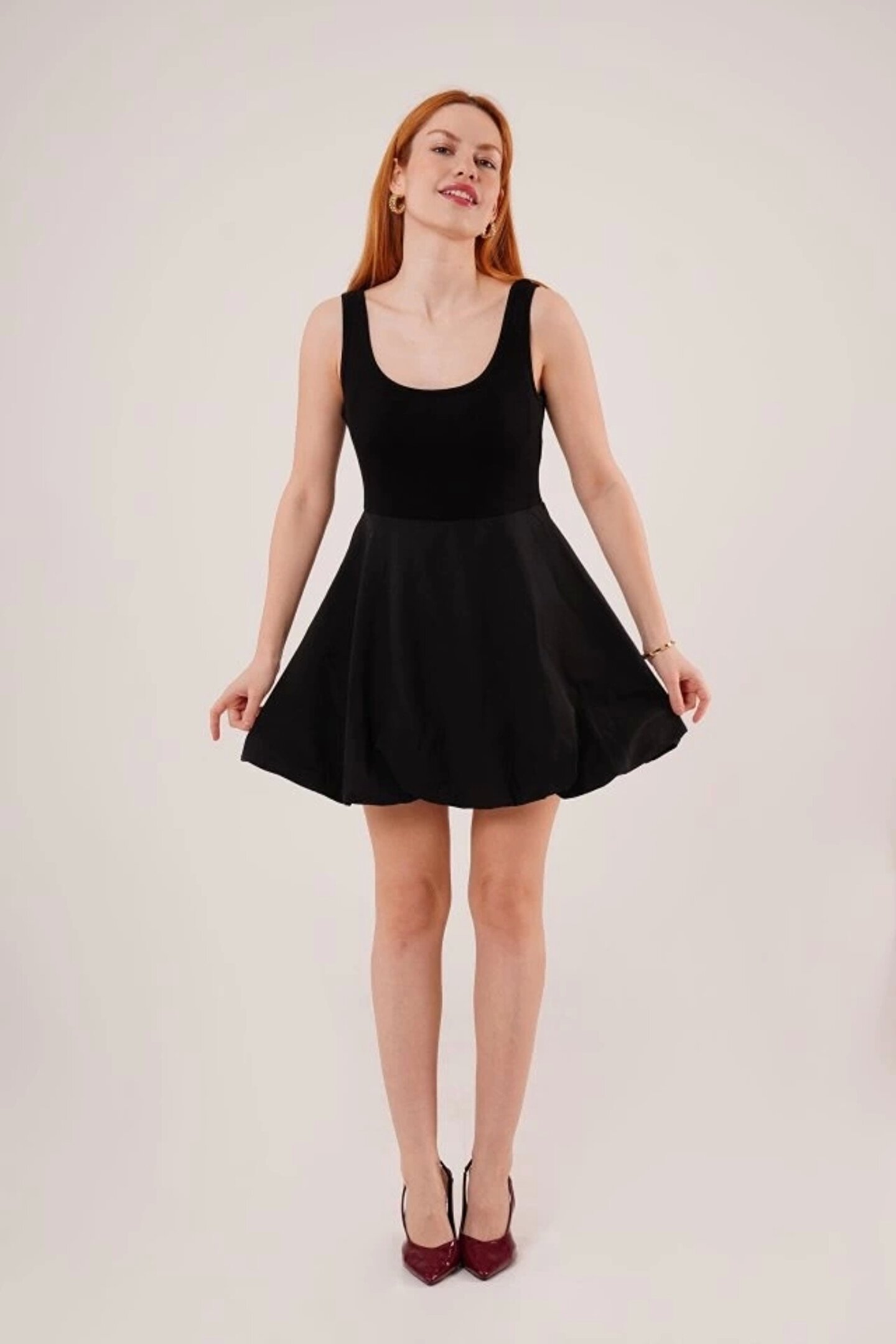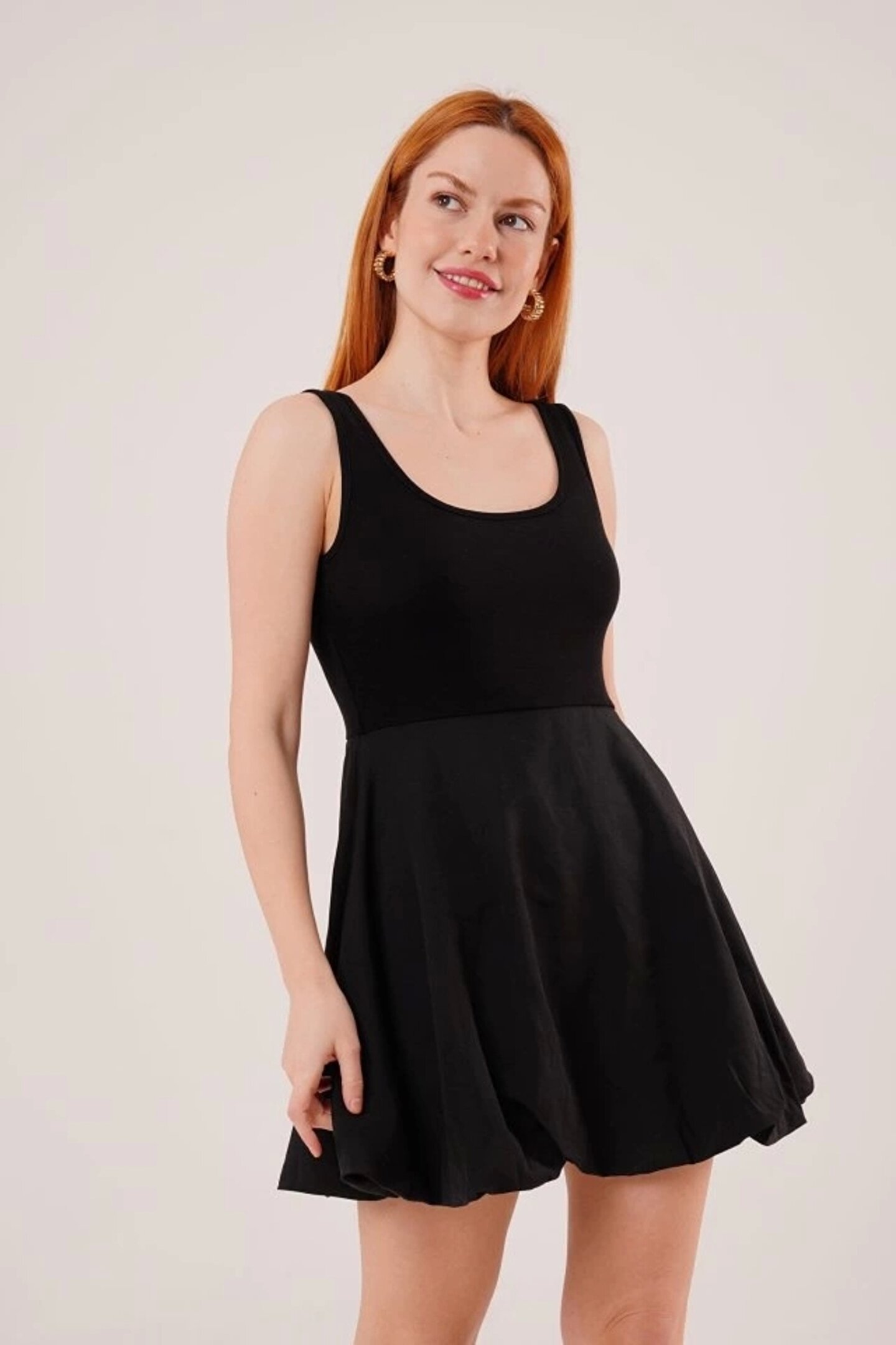 Kalın Askılı Balon Etek Siyah Mini Elbise