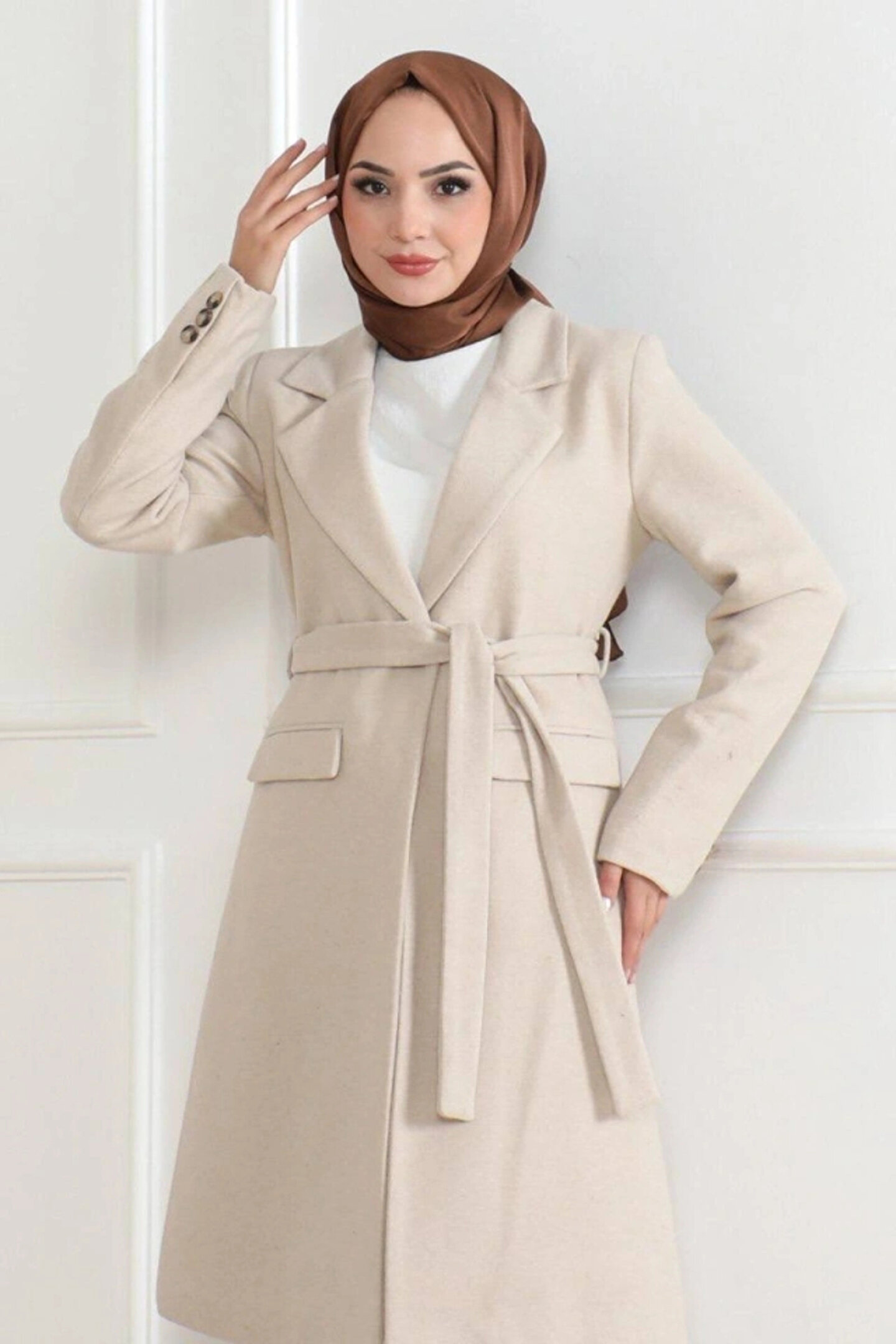 Kaşe Kaban – Uzun Boy Kruvaze Yaka, Kuşaklı Tesettür Kışlık Kaban, Astarlı Şık Yünlü Dokuma Oversize Rahat Kalıp, Cepli Modern Kaşe Mont Modeli - Bej