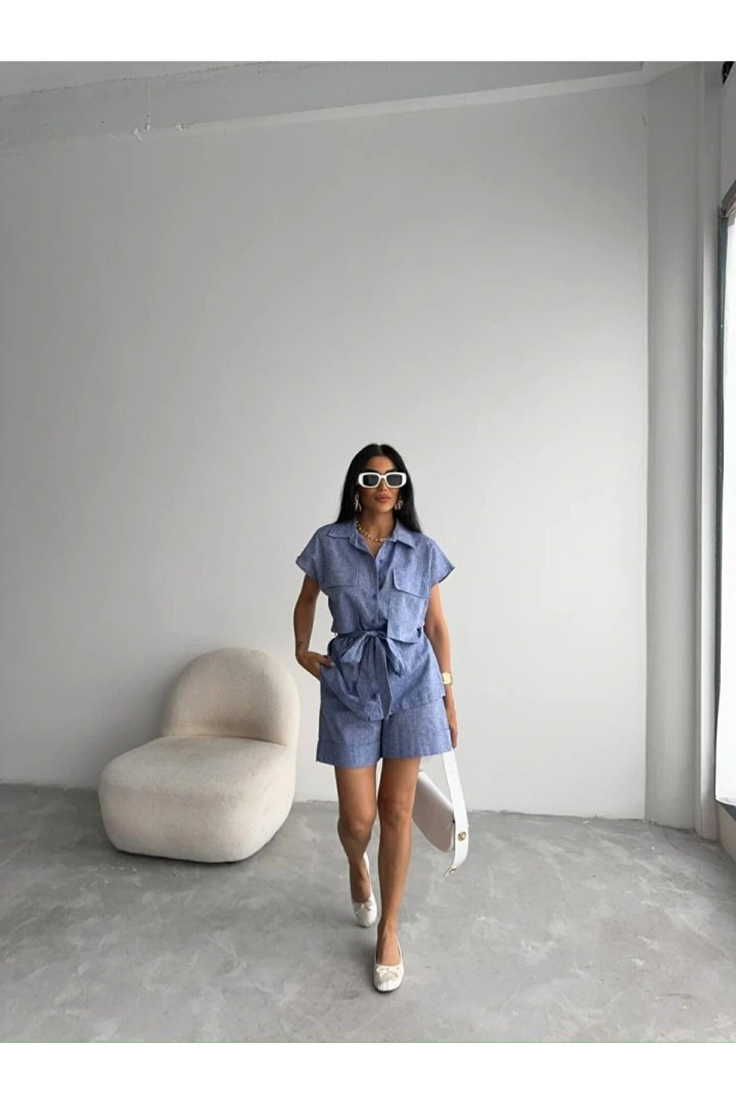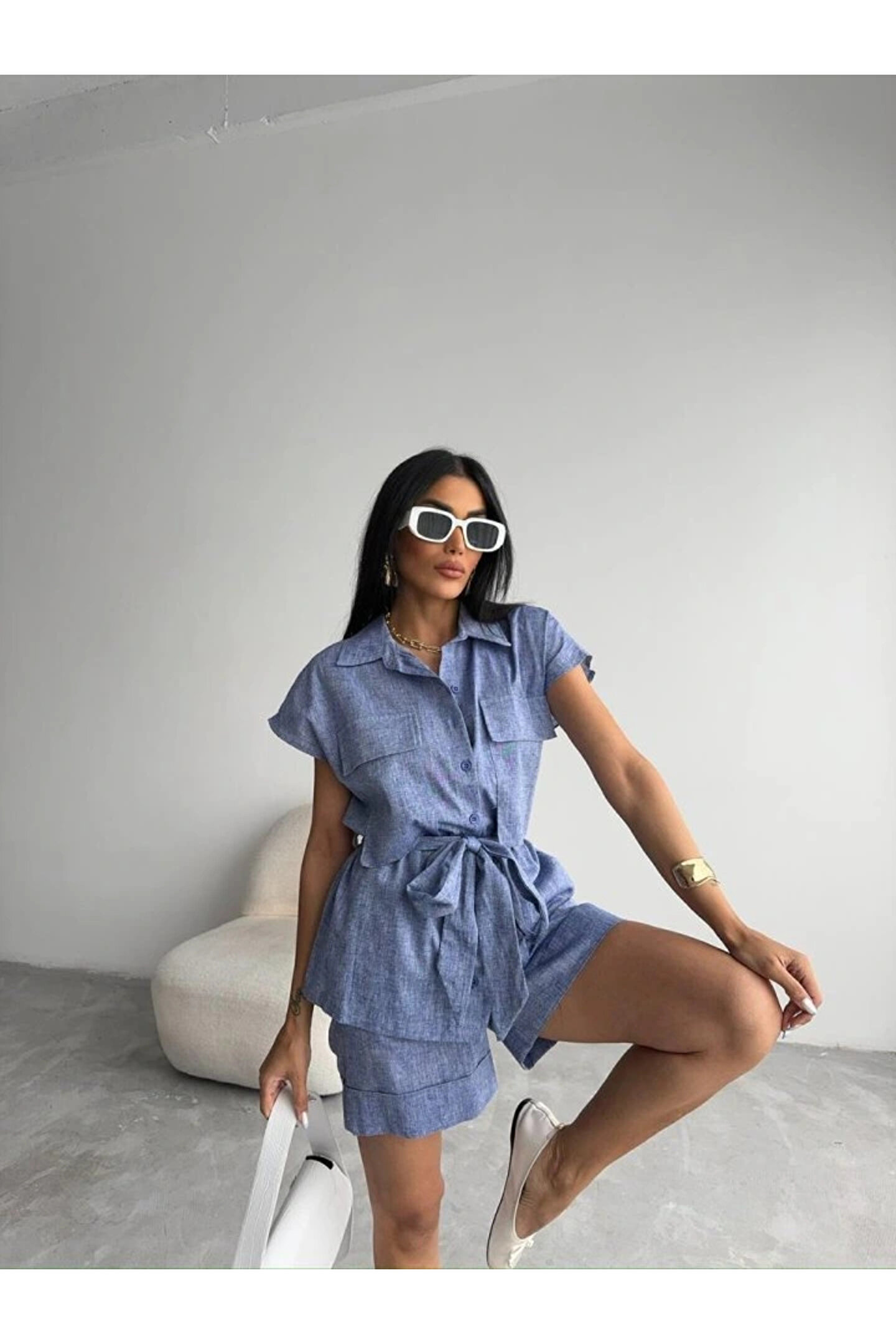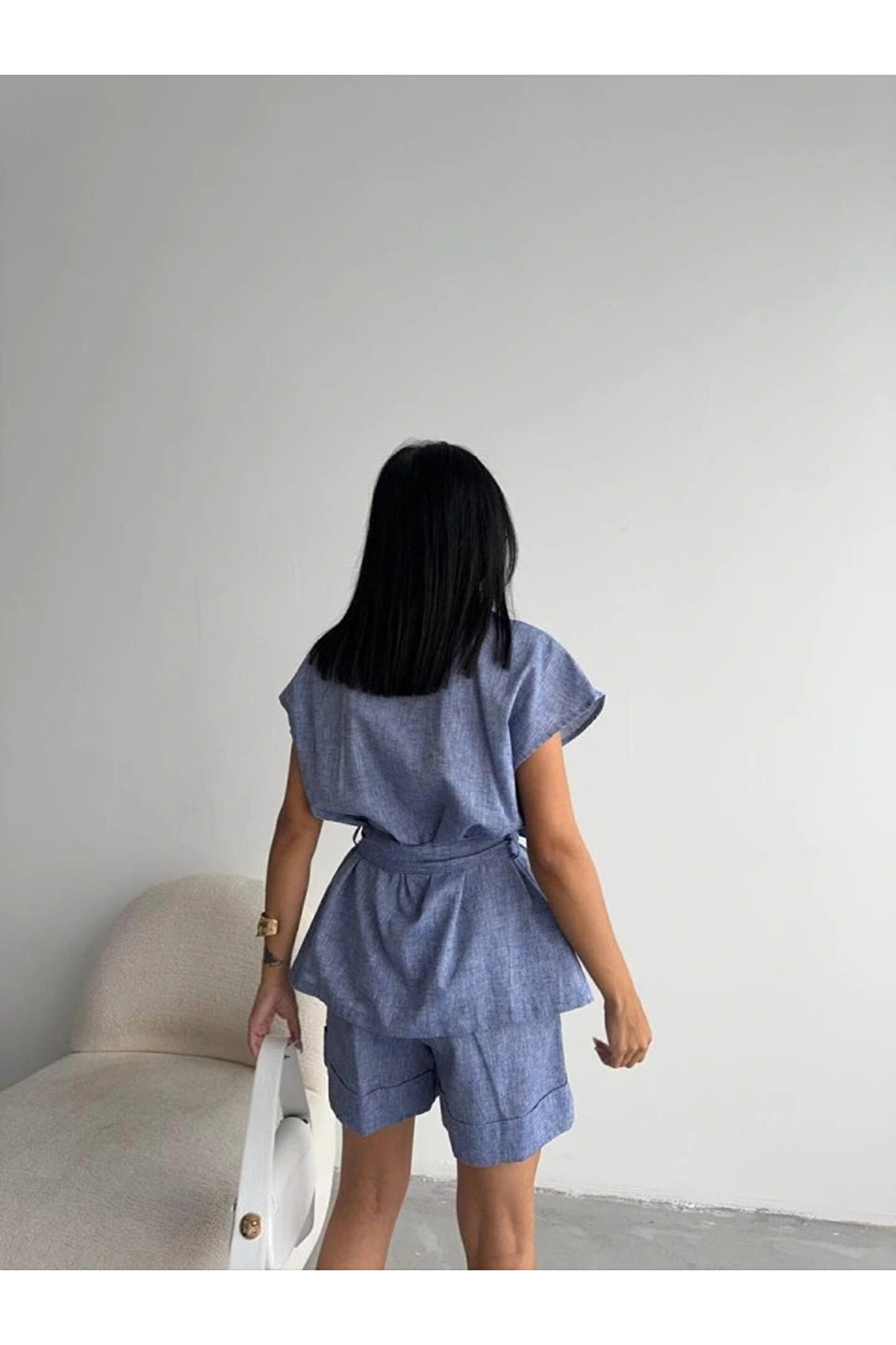 KETEN BAĞLAMALI KOLSUZ GÖMLEK - DUBLE PAÇA ŞORT TAKIM - Lacivert