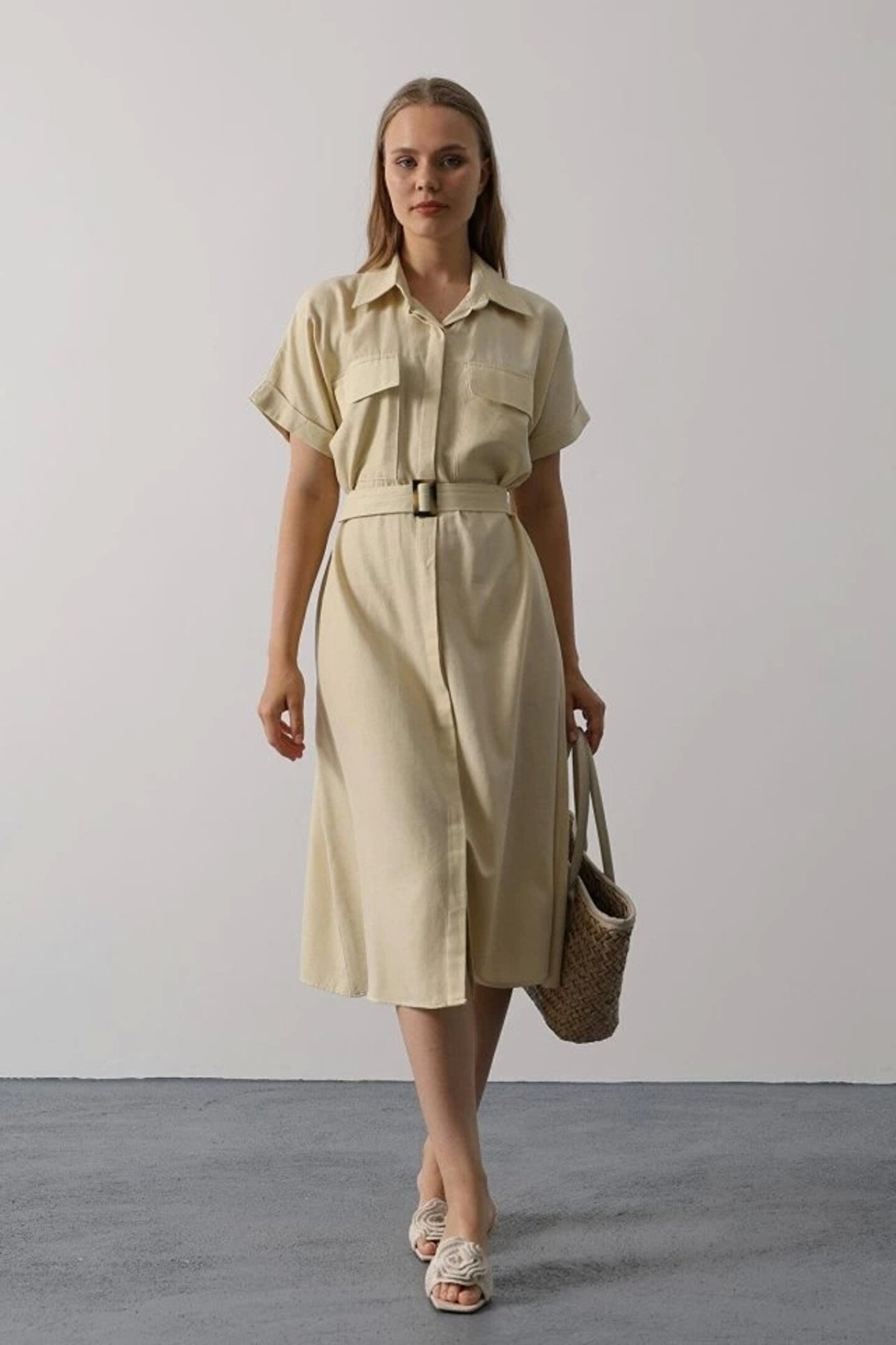 Silerra Kuşaklı Cep Detaylı Yarım Kol Elbise - Ekru