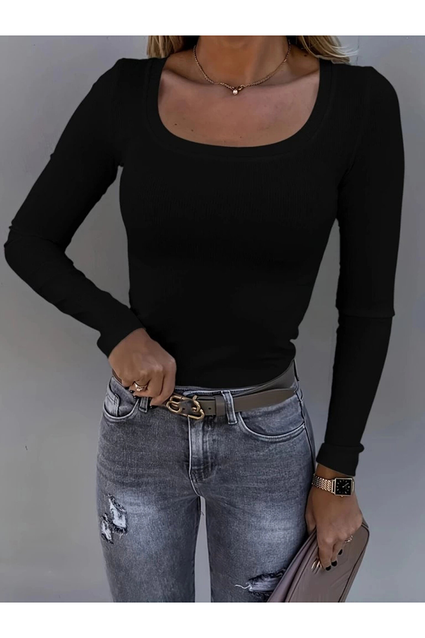 Kadın Uzun Kollu Derin Yuvarlak Yaka Kaşkorse Bluz