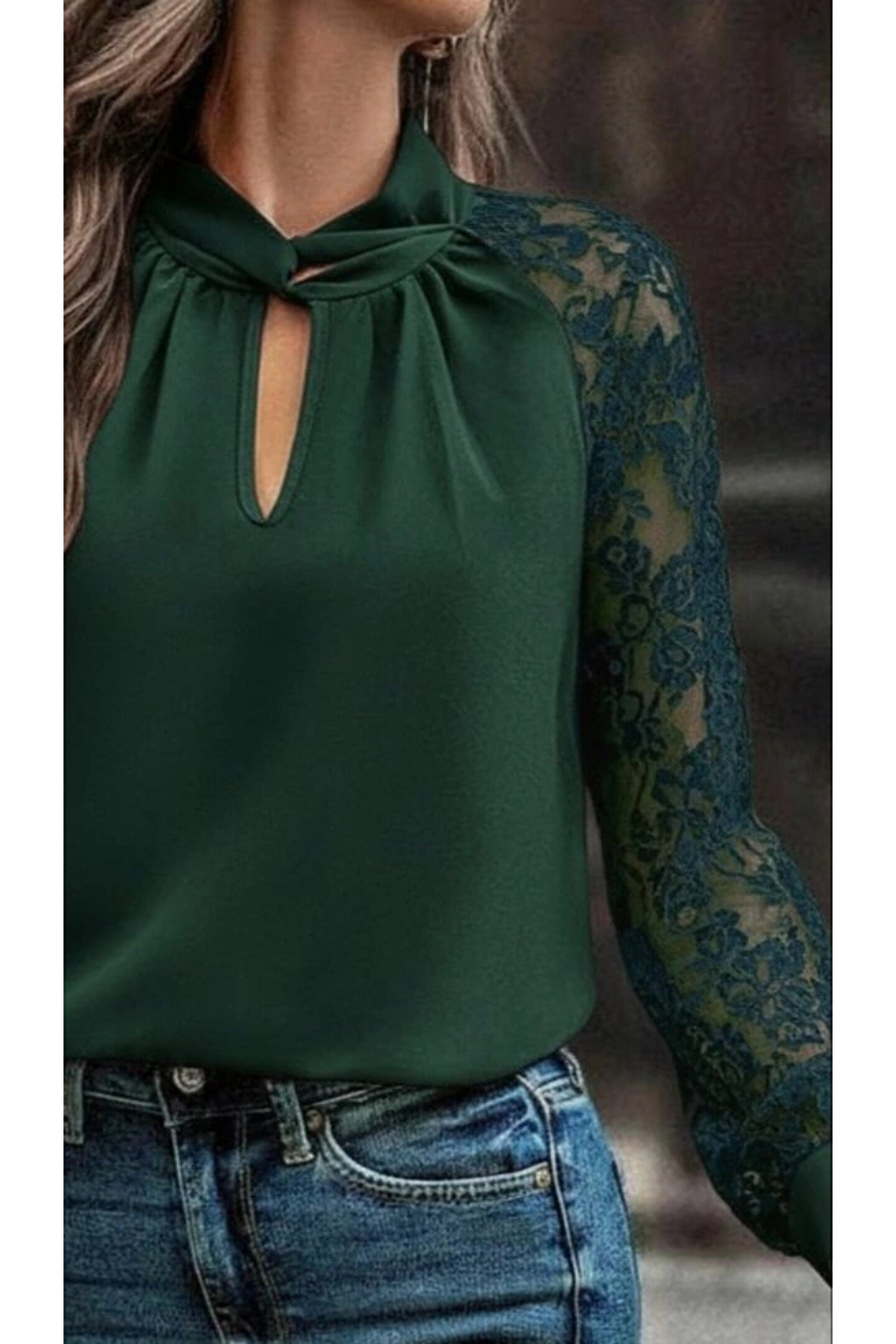 Kadın Uzun Kollu Göğüs Pencere Detay Yaka Boğazlı Kolları Tüllü Sandy Bluz