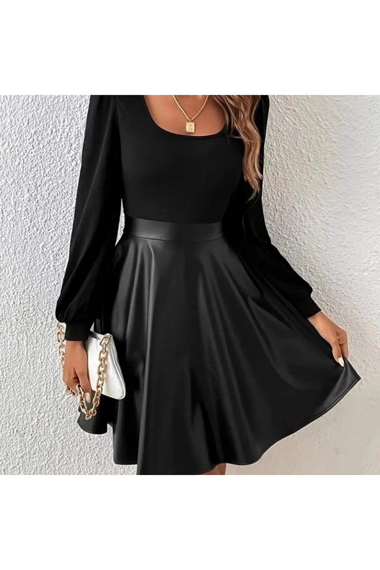 Kadın Uzun Kollu Kare Yaka üst Viskon Alt Deri Mini Elbise