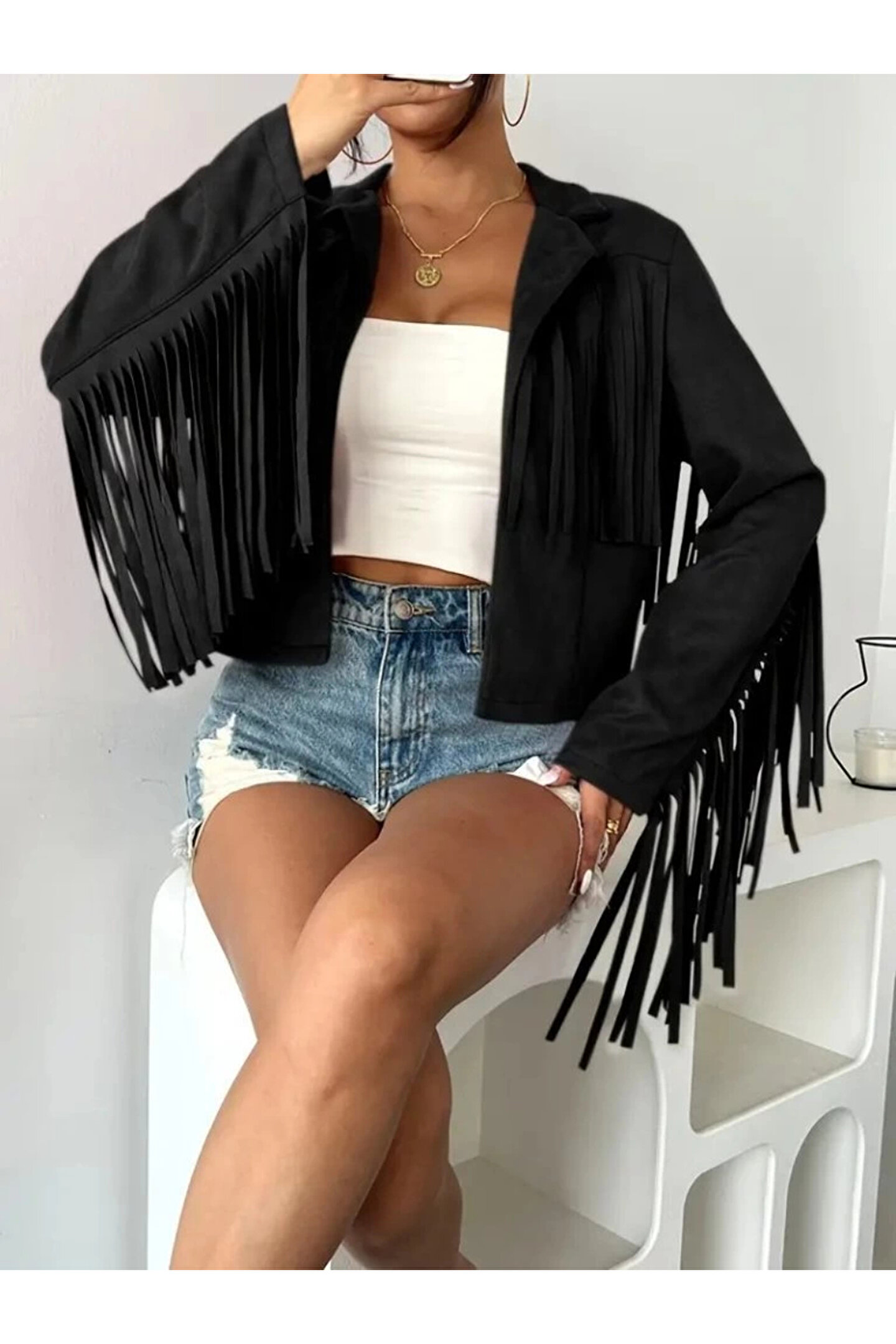 Kadın Uzun Kollu Yakalı Kısa Püsküllü Süet Ceket