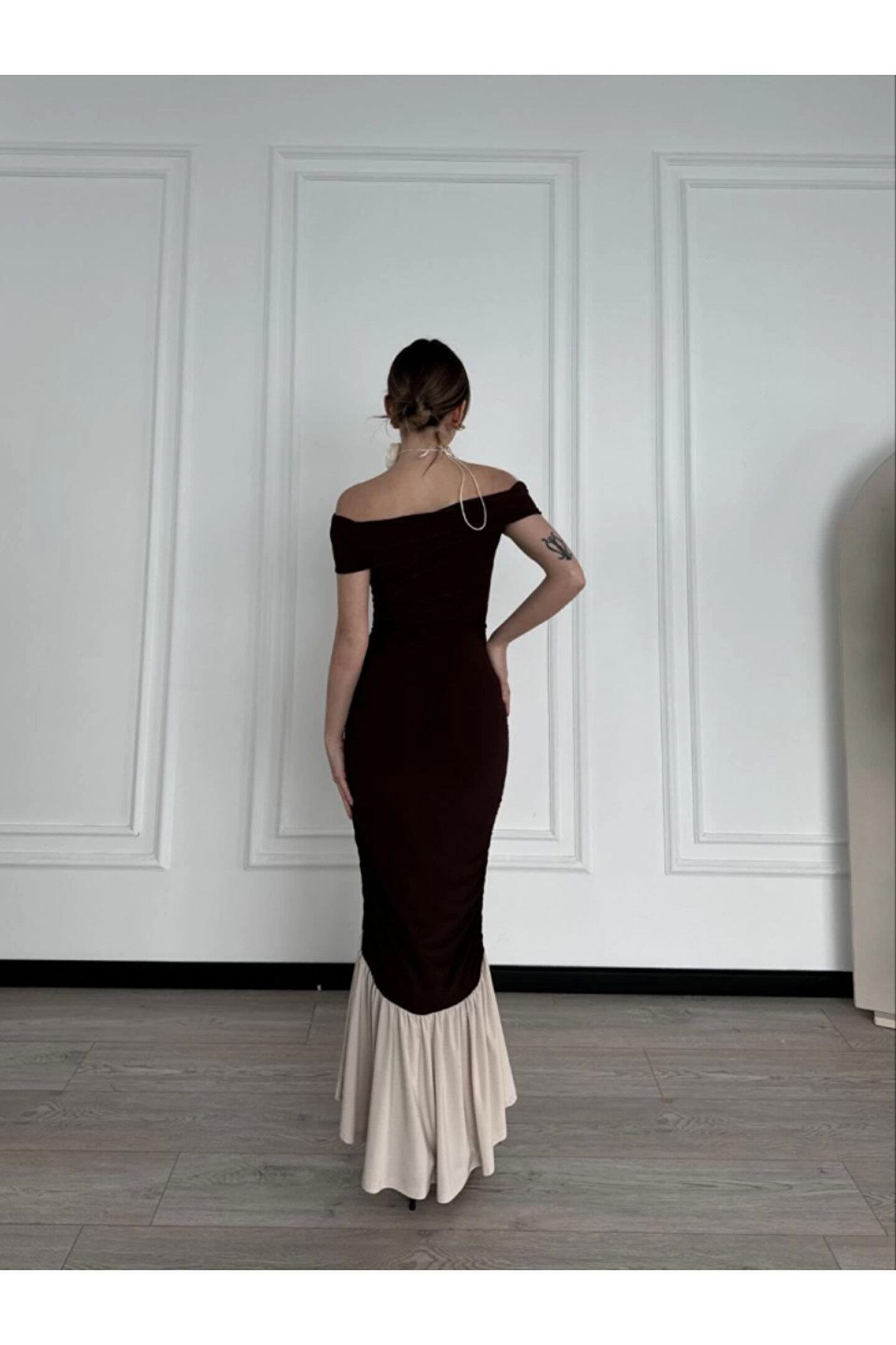 Silerra Striptiz Omuzlu Uzun Elbise- Kahve