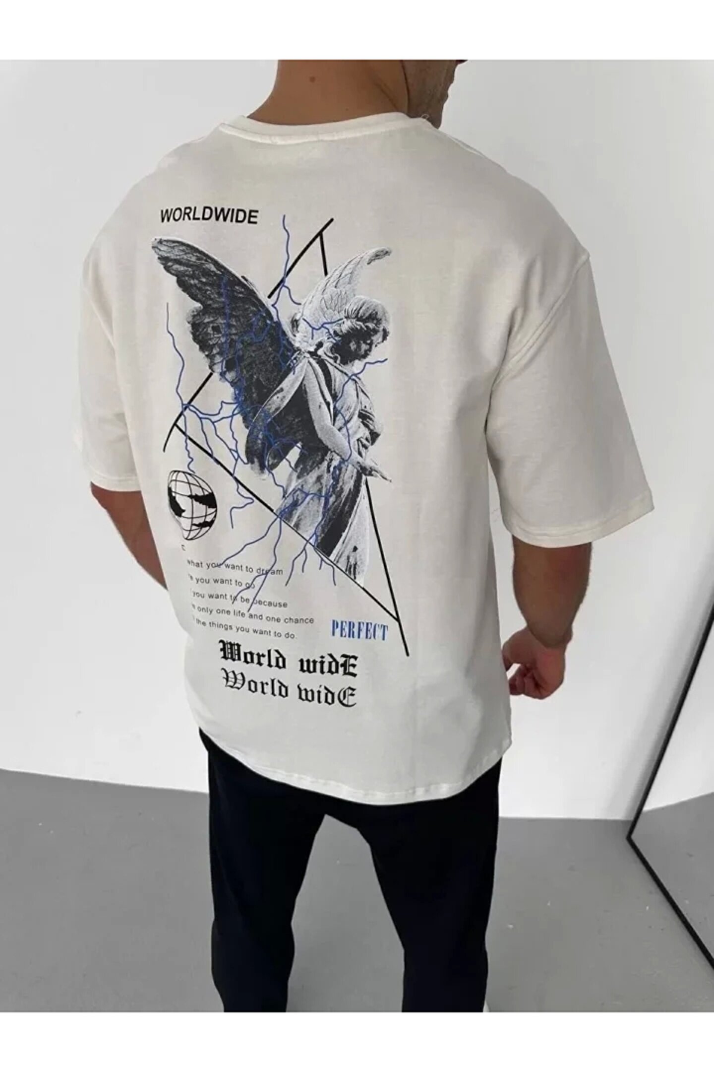 Unisex Bisiklet Yaka Baskılı Oversize T-Shirt - Beyaz