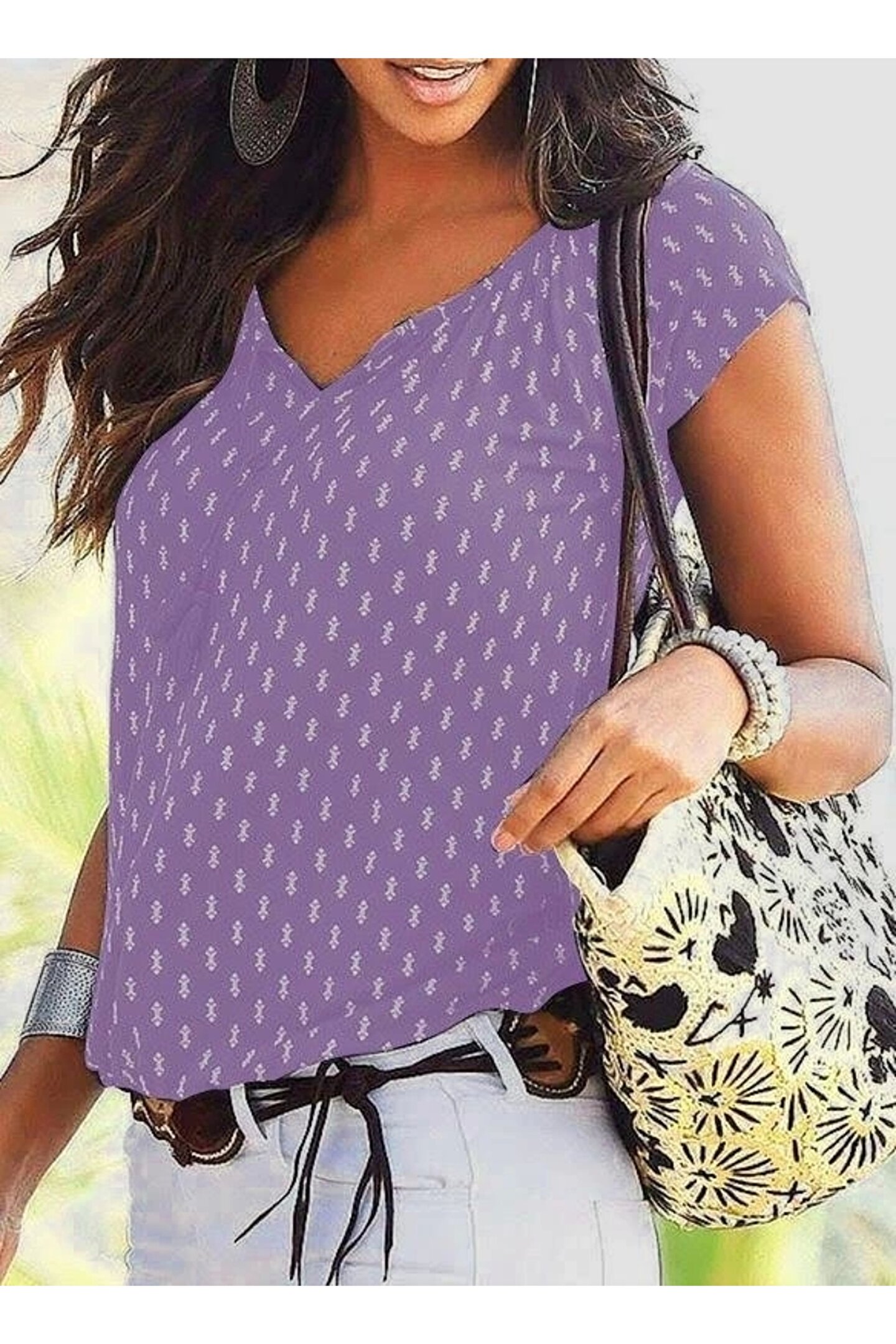 V Yaka Baskılı Mikro Kumaş Bluz