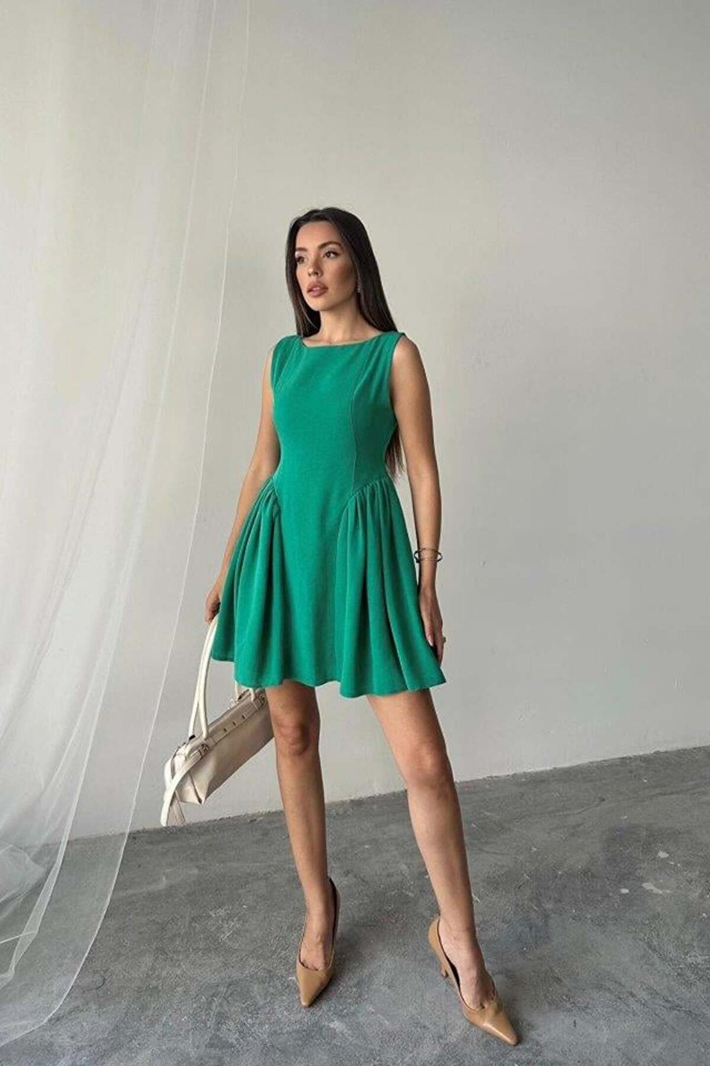 Yeşil Mini Boy Büzgülü Keten Elbise
