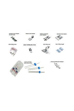 Singer bekozetina Berna bindallı Janome homemax gibi tüm dikiş makineleri için Ayaklar en çok kullanılan dikiş ayaklarıdır çift iğnemiz 2 milim 3 milim 4 milim olmak üzere paketin içinde çıkmaktadır görselde görmüş olduğunuz tüm ayaklar paket içerisinde çıkacaktır toplam 8 ayak ve ayak tutucu ile çift iğne seti 10 parçadır