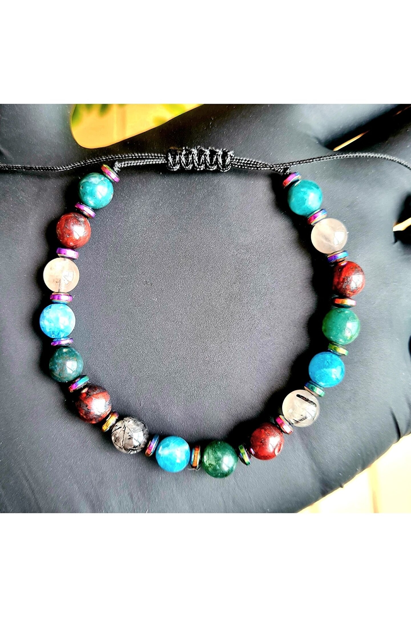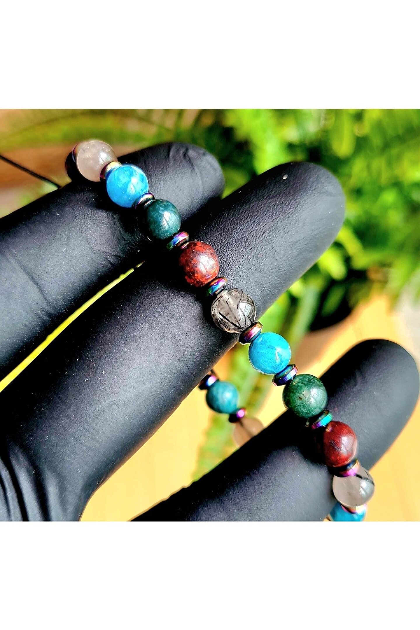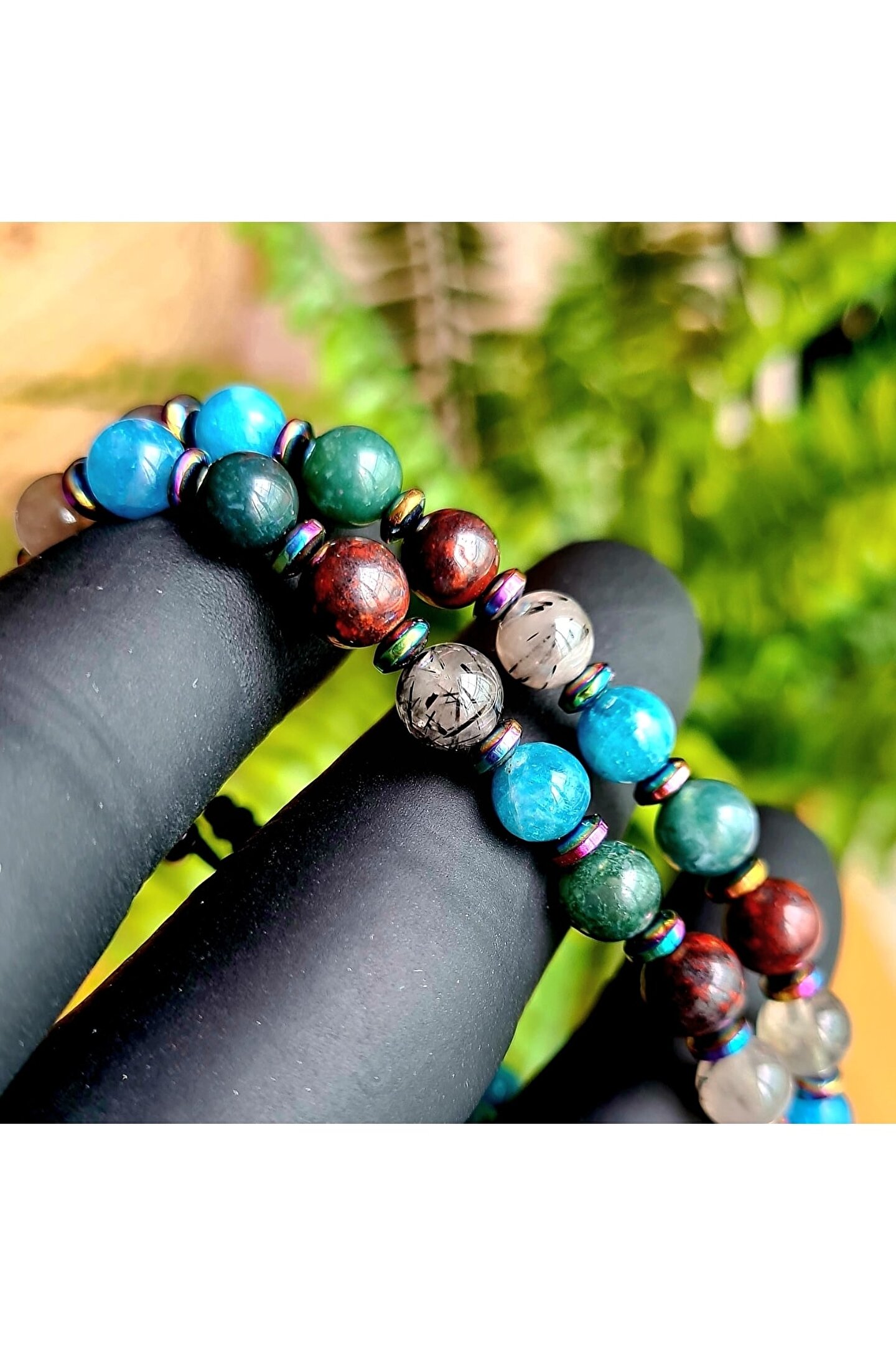 İkizler burcu için özel olarak tasarlanmış, doğanın saf güzelliğini yansıtan bir bileklik; Apatit, rutil kuvars, yosun akik ve kan taşı gibi doğal taşların eşsiz kombinasyonu ile hem şıklığı hem de enerjiyi bir arada sunar; Doğal taş materyali sayesinde her bileklik benzersizdir ve her kullanımda farklı bir deneyim sağlar; İkizler burcu bireylerinin enerjilerini dengelemelerine yardımcı olacak bu bileklik, kişisel stilinizi tamamlamanız için ideal bir aksesuardır;