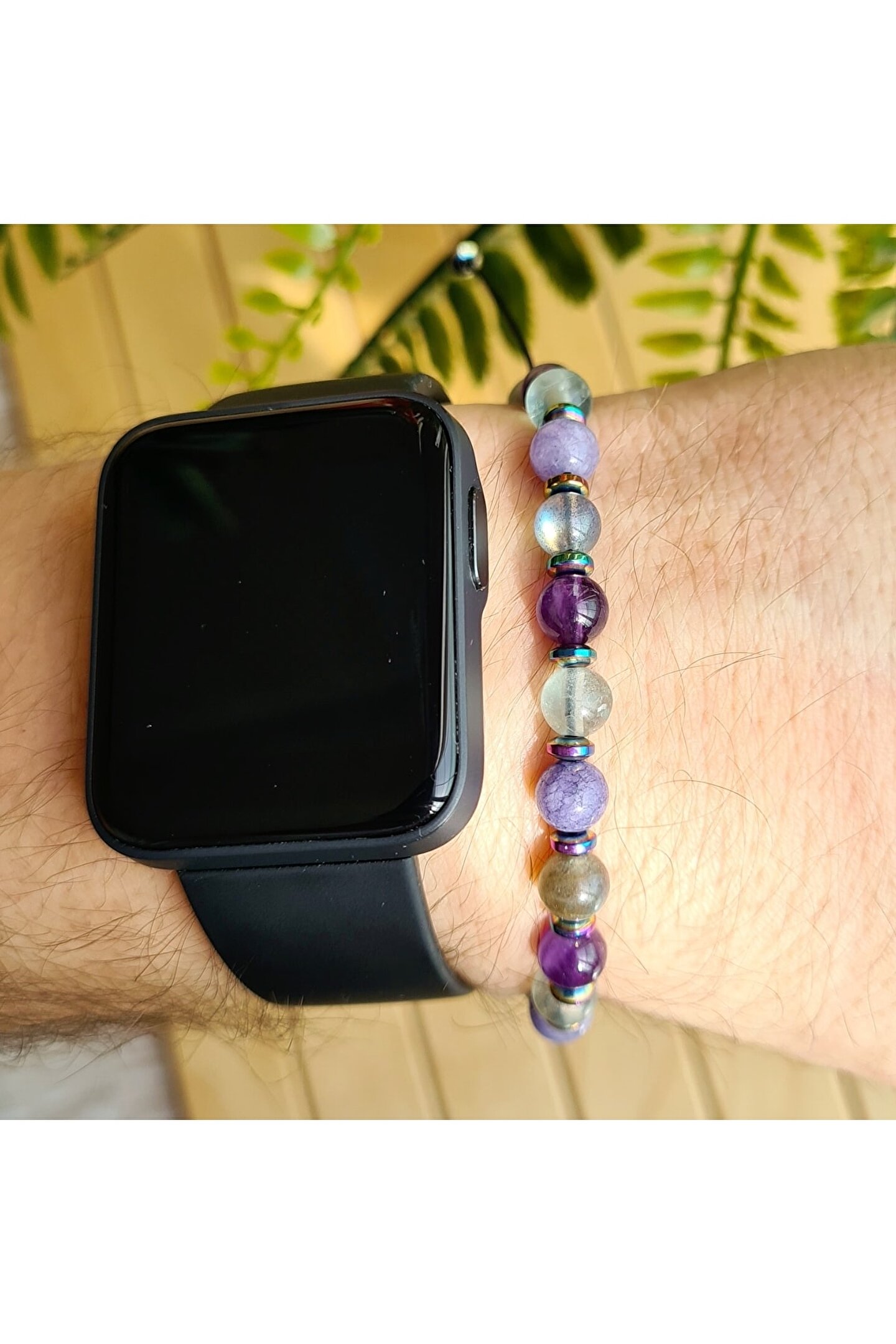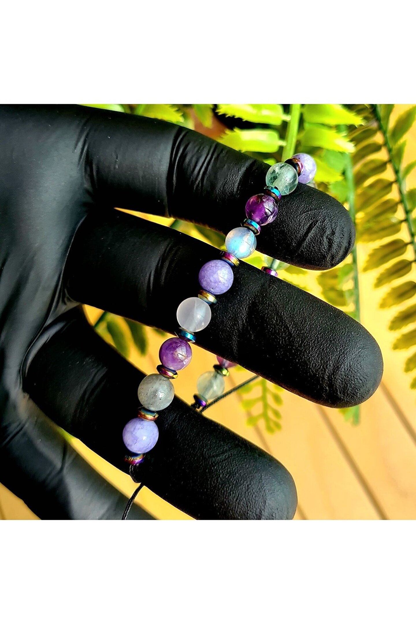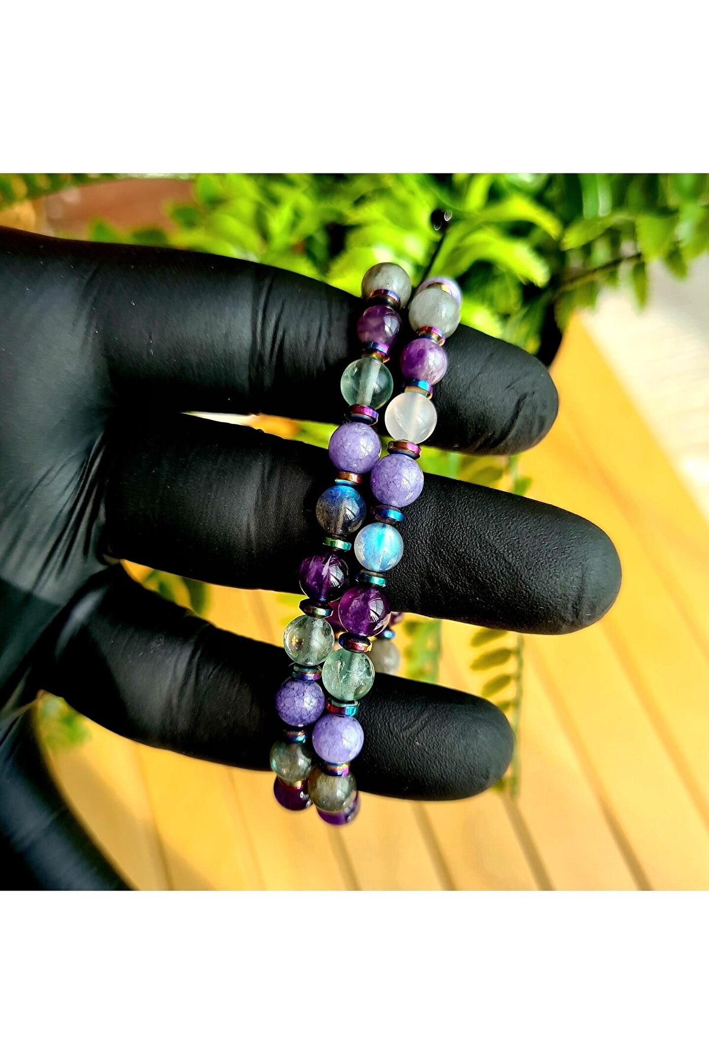 El yapımı tasarımıyla öne çıkan bu bileklik, her bir parçasında özenle seçilmiş doğal taşlar kullanılarak üretilmiştir; Florit, ametist, labradorit ve angelite gibi nadir bulunan ve şık bir görünüm sunan taşlarla tasarlanmıştır; Doğal taş materyali sayesinde her bileklik benzersiz ve eşsiz bir dokunuşla öne çıkar; Kova burcu bireyleri için özel olarak tasarlanmış bu bileklik, kişisel tarzınıza zarif bir dokunuş ekler;