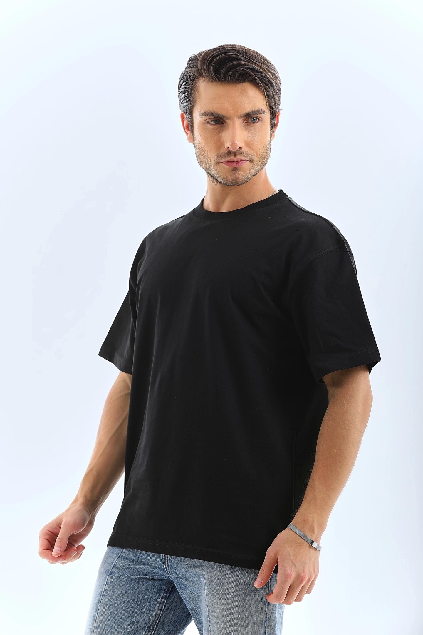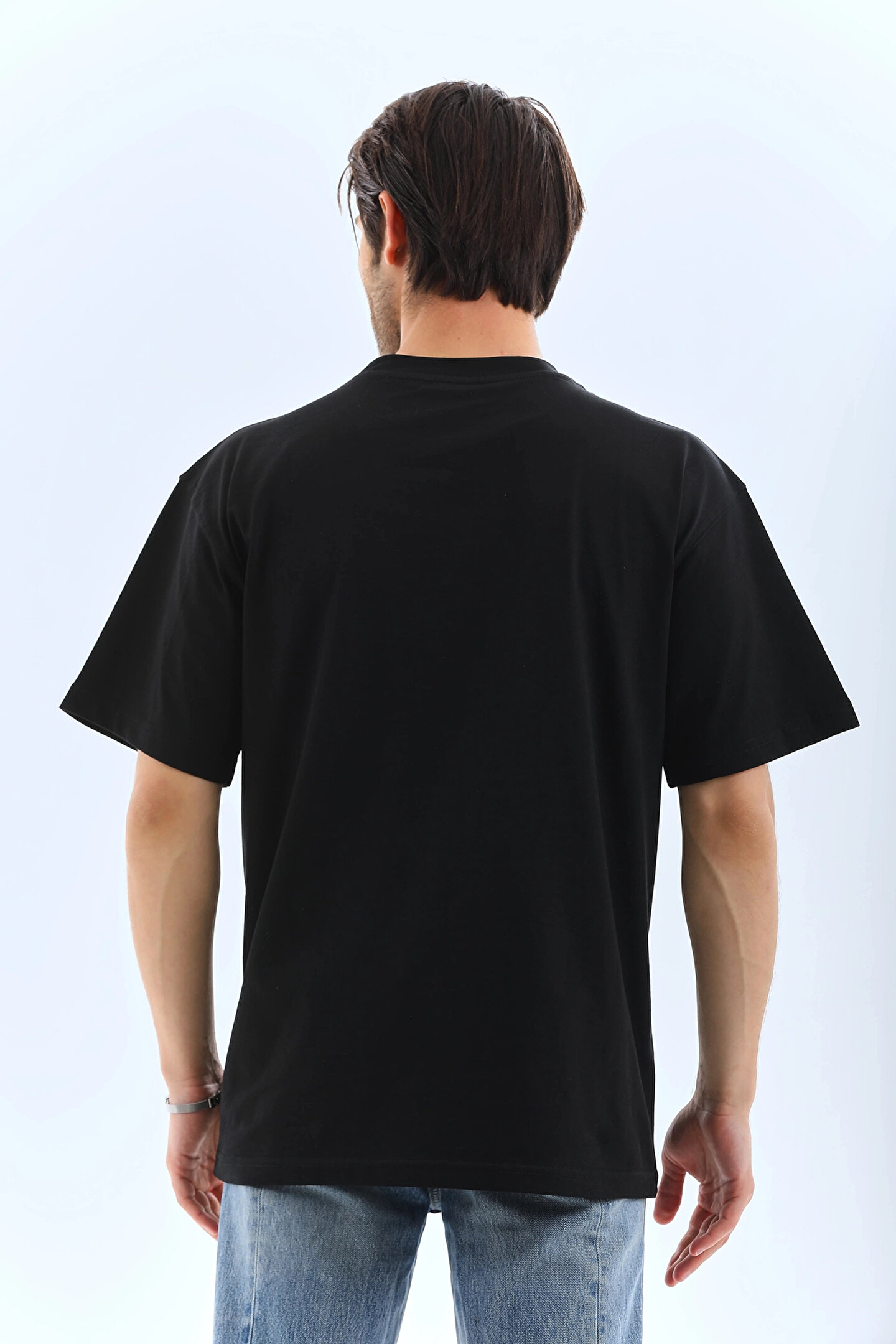 Unisex Oversize Düz Bisiklet Yaka T-Shirt - Siyah