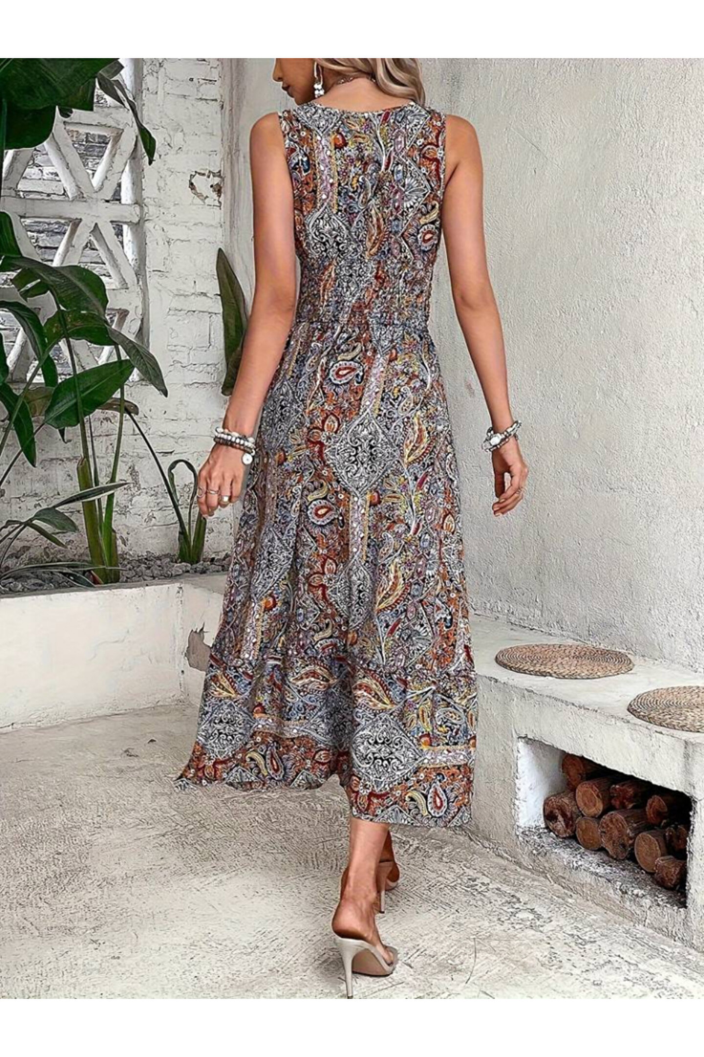SoSoStyle Kadın Beli Gipeli Etnik Desen Sıfır Kol Süprem Elbise