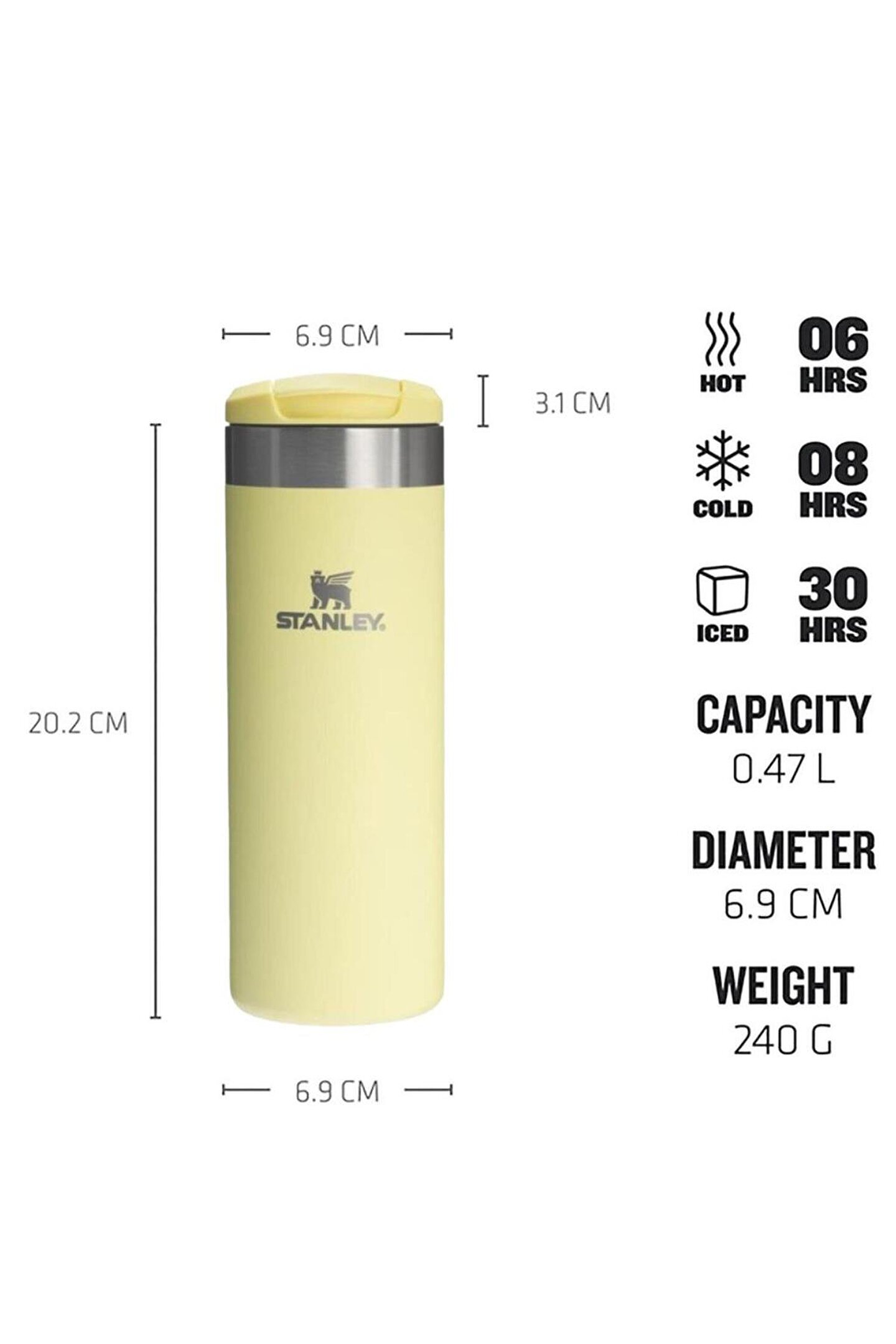 Stanley The AeroLight Transit 0,47L Termos Bardak Taşıması kolay bu pratik bardak ile içecekleriniz her zaman yanınızda ve taze olacak.; 6 saat sıcak 8 saat soğuk tutma kapasitesi sayesinde içeceklerin ısısını uzun süre korur.; AeroLight™ serisi hafifliği ile ön plana çıkmış olan bir seridir ve bu model 244 Gram ağırlığındadır.; 18/8 paslanmaz çelik ve BPA içermeyen yapısı sayesinde oldukça dayanıklıdır.; Çift duvarlı yapıya ve kilitli kapağa sahiptir.; Otomobillerde bulunan bardak haznesi ile uyumlu genişliğe sahiptir.; Ağırlık: 244 Gram Boyutlar: 6,85 x 7,11 x 20,32 cm Sıcaklık: 6 Saat Soğuk: 8 Saat Buz Takviyeli: 30 Saat