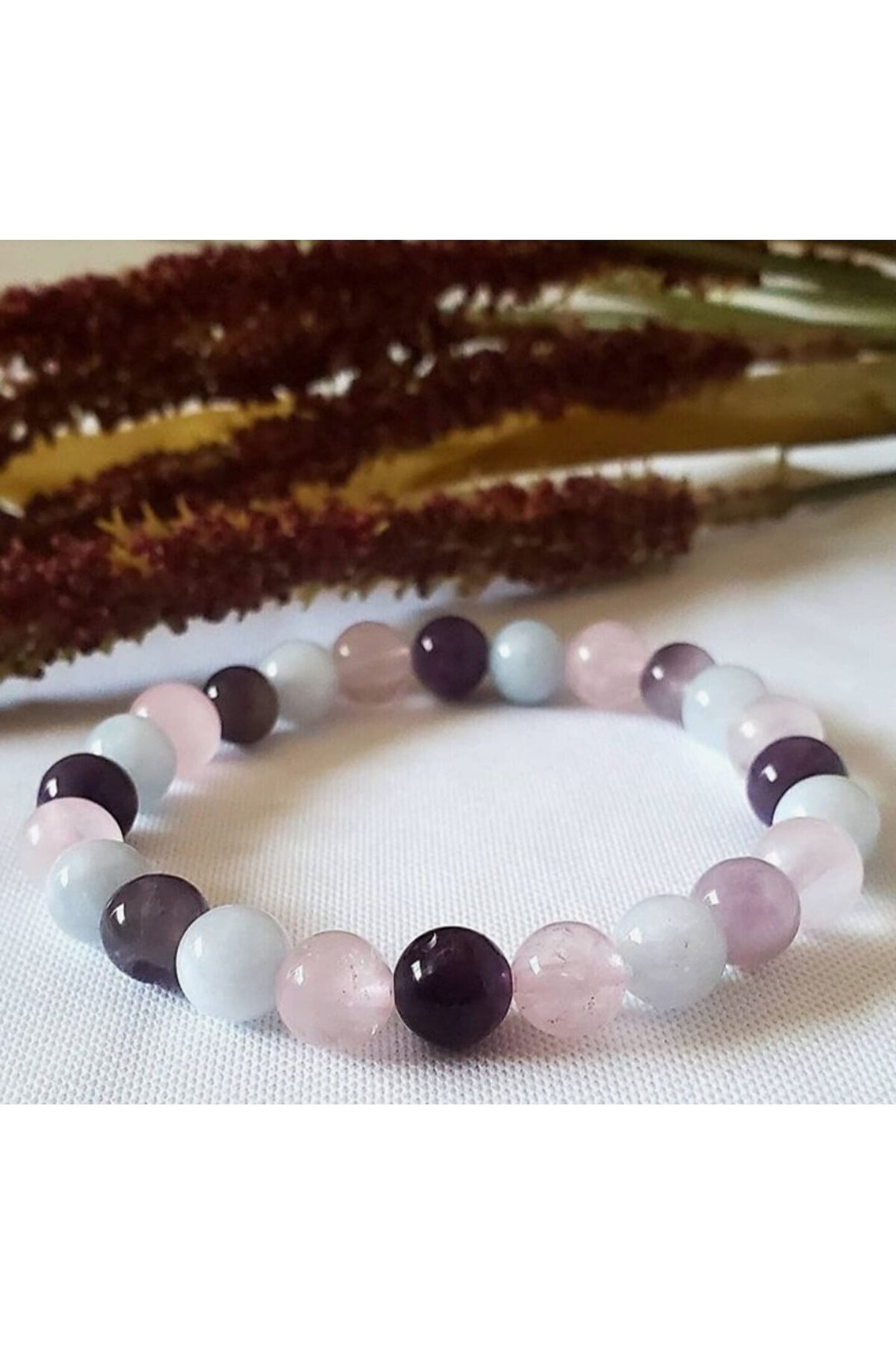 Doğal taş kullanımı sayesinde her bileklik benzersiz ve otantik bir görünüm sunar; Akuamarin ve ametist taşlarının uyumlu kombinasyonu, hem şıklığı hem de enerjiyi bir arada barındırır; Pembe kuvarsın zarif tonları, bilekliğe feminen bir dokunuş katarken, modern tasarımıyla dikkat çeker; Taşın doğal yapısı, bilekliğin dayanıklılığını artırarak uzun süreli kullanım imkanı sağlar;