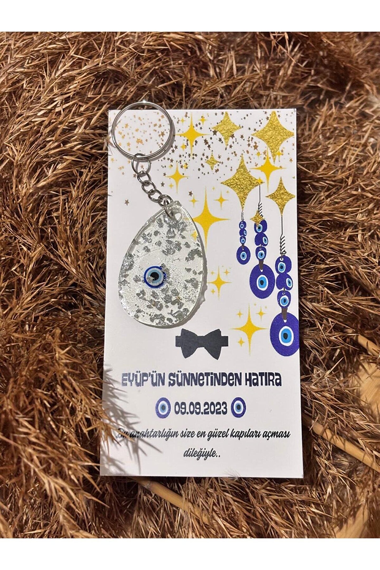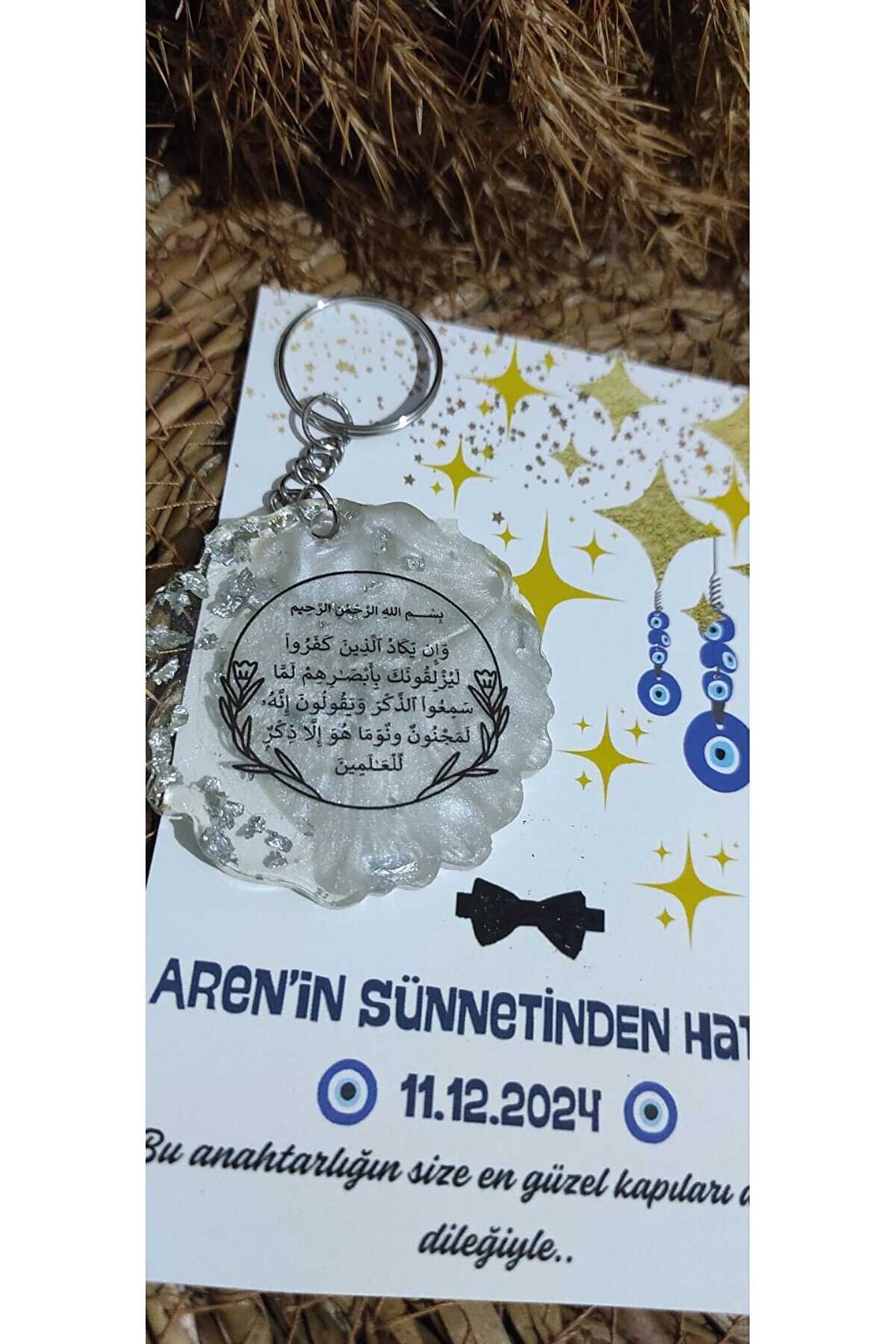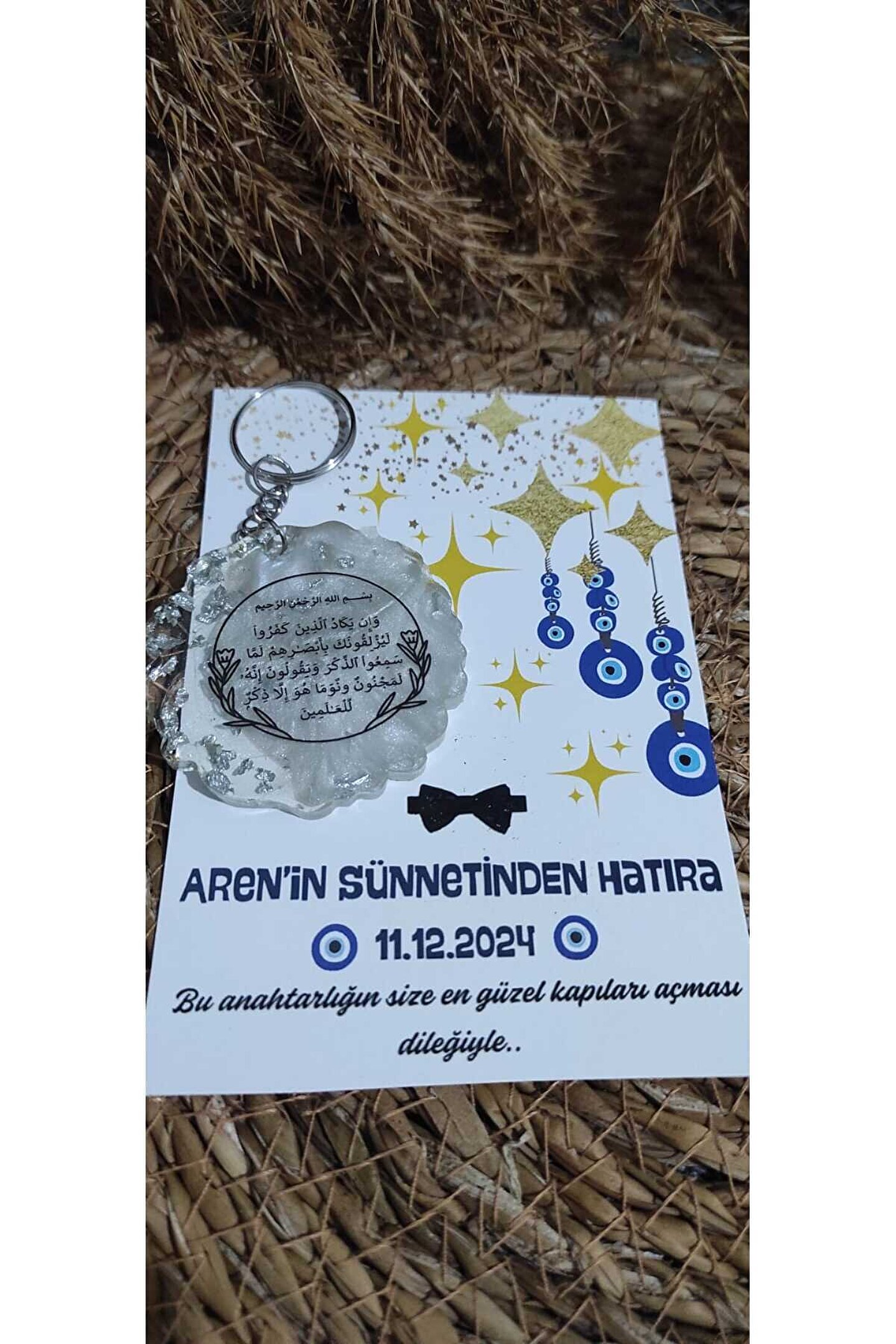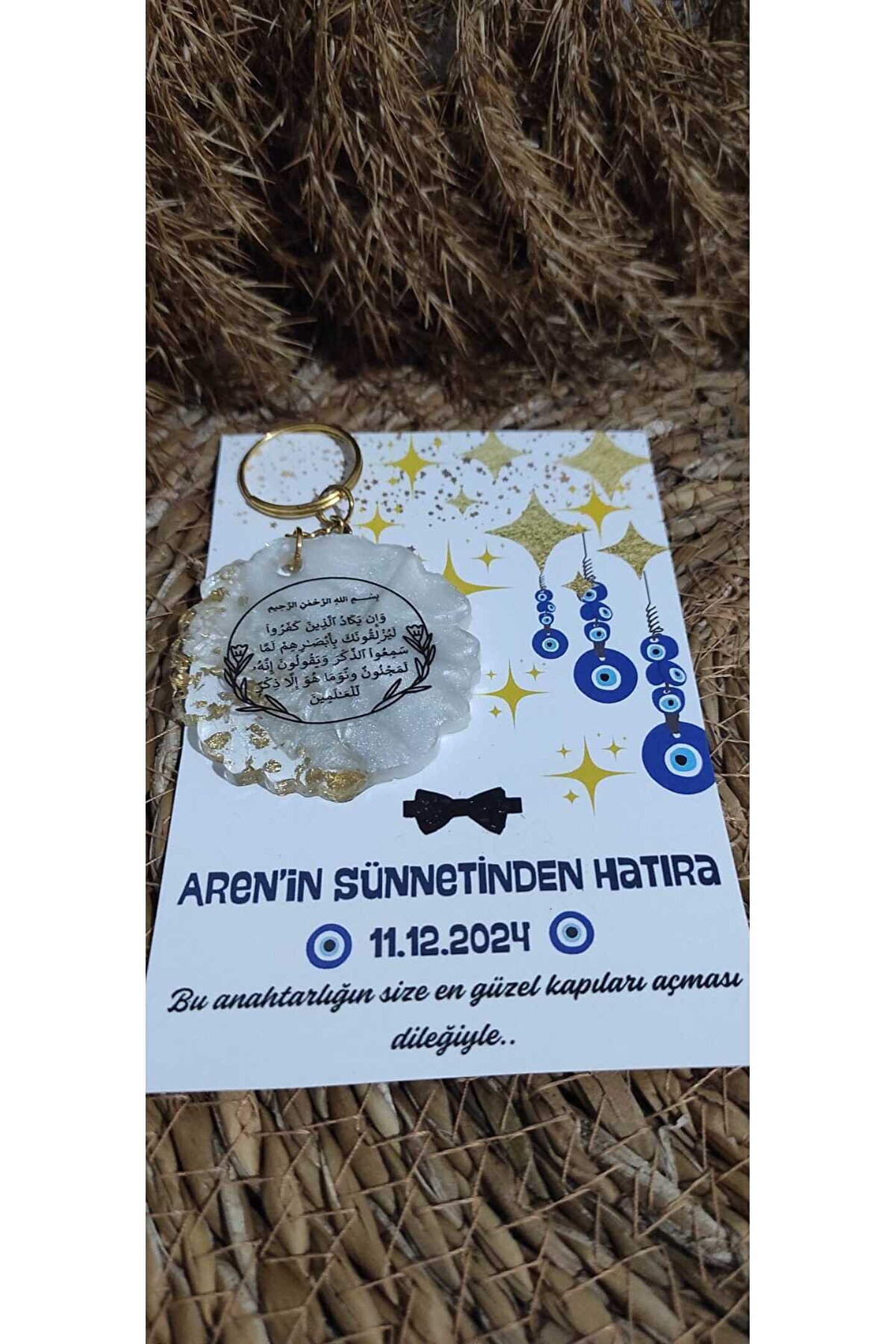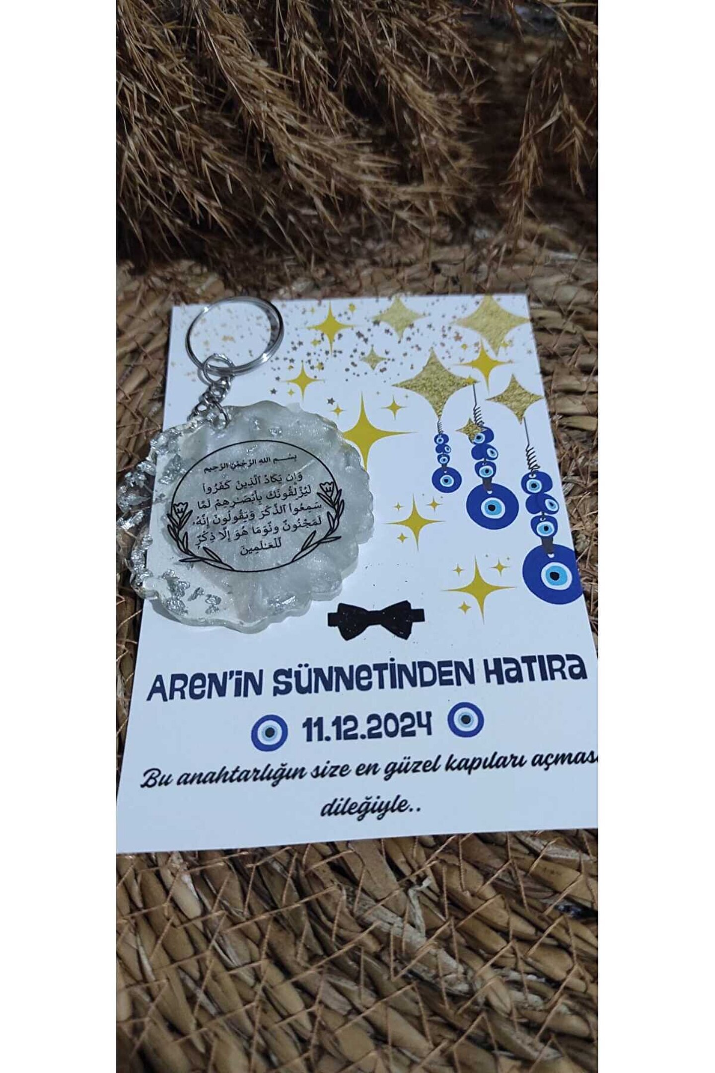 8 Adet Özel baskı tasarım kartlı epoksi anahtarlık hediye setleri ; Nazar boncuğu kartlı ve nazar ayeti baskılı epoksi anahtarlık seti ; Gönderim yapılacak olan anahtarlık renkleri stoklara bağlı olarak değişiklik gösterebilmektedir (gold veya gümüş ); Her ürün tek tek jelatinlenerek gönderim yapılmaktadır ; Alıcının siparişi oluşturduktan sonra 24 saat içinde sipariş numarası ile birlikte isim-tarih-özel not gibi taleplerini satıcıya sor kısmından iletmesi gerekmektedir ; Aksi durumda standart baskı ile gönderim yapılacaktır ;