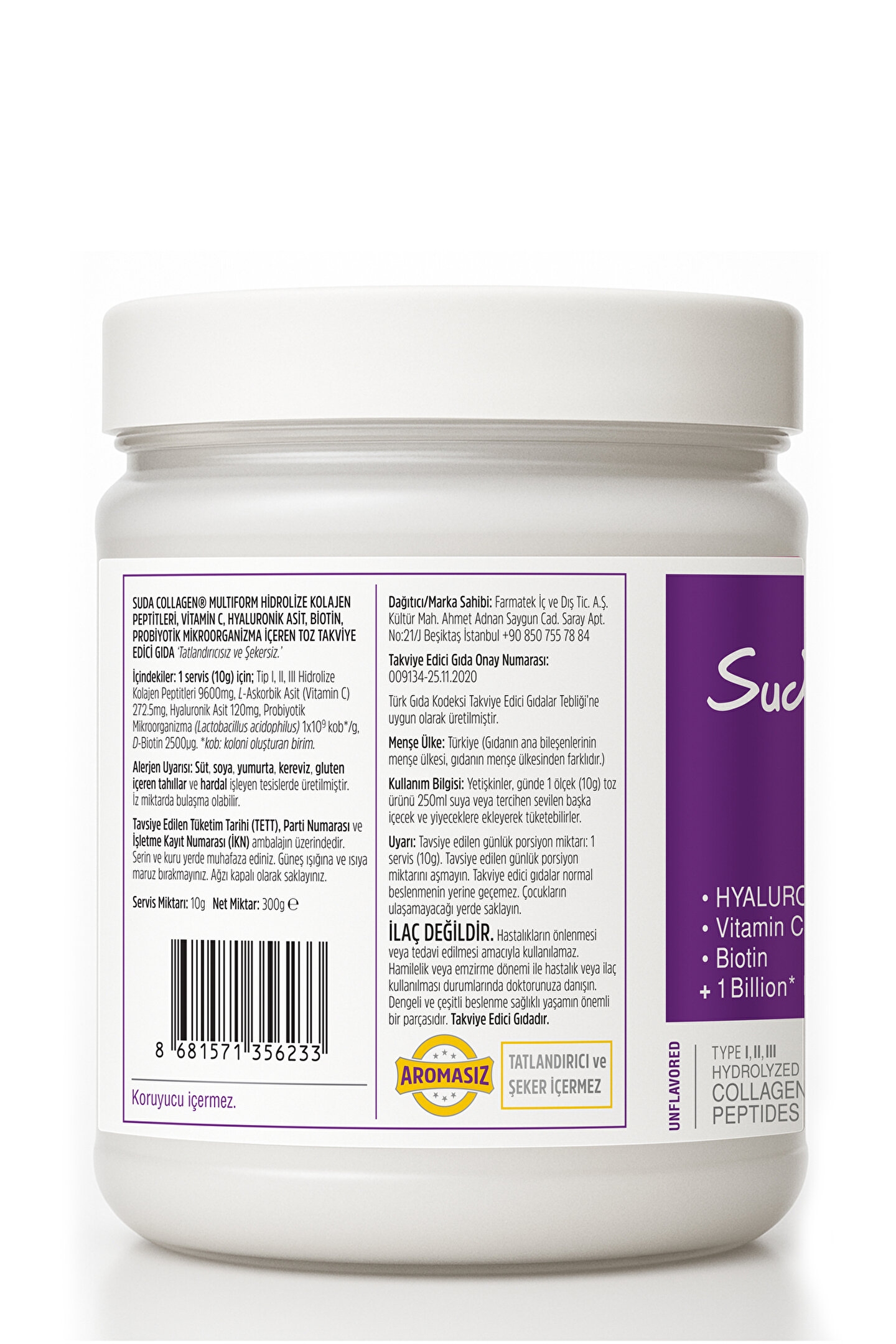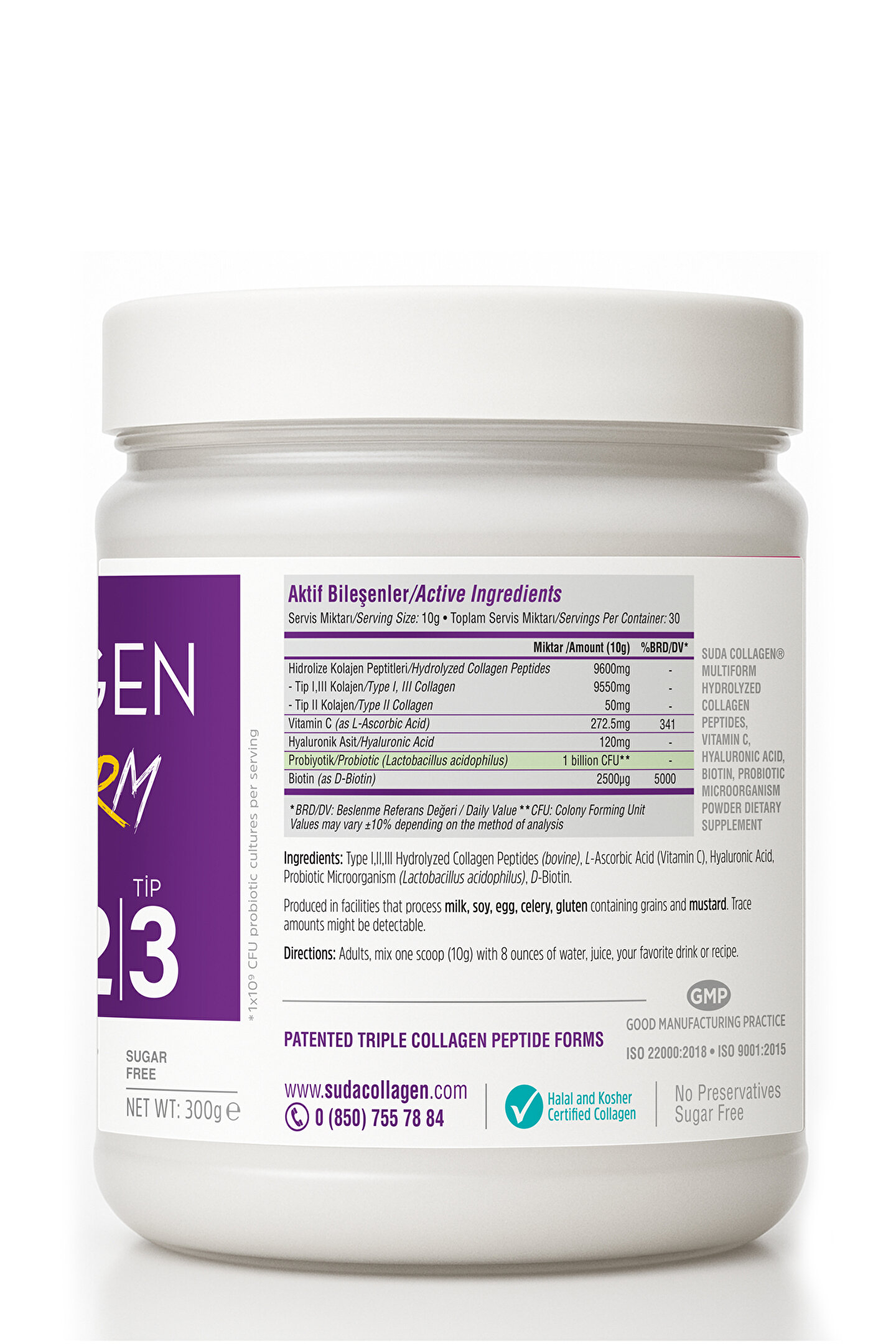 Suda Collagen Multiform Powder 300g, Alman Gelita Fortigel® ve Tendoforte® patentli kolajenleri ile formüle edilmiş, %100 sığır kaynaklı ve helal sertifikalıdır.; ; Suda Collagen Multiform Powder 300g, yüksek doz kolajen ve destekleyici aktiflerle kişisel kullanım esnekliği sunan premium bir güzellik ritüelidir.; ; Her porsiyonda 9600 mg kolajen ile kendi güzellik ve sağlık karışımınızı yaratın; ister kahvenize, ister smoothienize ekleyin.; ; Aromasız, saf formülü sayesinde tamamen sizin zevkinize göre özelleştirilir.; ; Güçlü içerikler, klinik destekli kalite ve kişisel dokunuşun birleşimiyle, güzellik ve sağlığı günlük rutininize zahmetsizce taşıyın.; ; Kimler için?; Kendi güzellik ve sağlık ritüelini oluşturmak isteyen, özelleştirilmiş takviye kullanımını seven herkes için.; ; Ne işe yarar?; Cildin sıkılığını ve nemini artırır, saç ve tırnak sağlığını güçlendirir, sindirimi ve , gençlik ışıltısını geri kazandırır.; ; Nasıl kullanılır?; Günde 1 porsiyon (10 g), sevdiğiniz içecekle karıştırarak kullanın.; Aromasız formülüyle kahve, smoothie, yoğurt gibi farklı seçeneklere uyum sağlar.; ; Ürün Faydaları; • Ultra Yüksek Doz 3 Tip Kolajen; Tip I, II, III Hidrolize Kolajen Peptitleri toplamda 9600 mg: cilt sıkılığı, dolgunluk ve gençlik desteği.; ; • Youthful Skin Boost; 120 mg Hyaluronik Asit + 272.5 mg Vitamin C ile cilt nemini artırır, doğal parlaklık kazandırır.; ; • Bağışıklık & Enerji Desteği; 272.5 mg Vitamin C ile bağışıklık sistemine ve enerji üretimine destek olur, kolajen sentezini hızlandırır.; ; • Cilt, Saç & Tırnak Bakımı; 2500 mcg Biotin ile güçlü saçlar, sağlıklı cilt ve sağlam tırnaklar.; ; 1 milyar probiyotik KOB ile sindirim sağlığını destekleyerek içsel güzelliğinizi artırır.; ; • Pratik ve Kişisel Kullanım; Aromasız toz form: kahve, smoothie, yoğurt veya suyla kolayca karıştırılır.; Kendi güzellik ritüelinizi kişiselleştirin.; ; • Patentli ve Güvenilir İçerik; Alman Gelita Fortigel® ve Tendoforte® içerikleri ile %100 sığır kaynaklı, helal sertifikalı kolajen desteği.