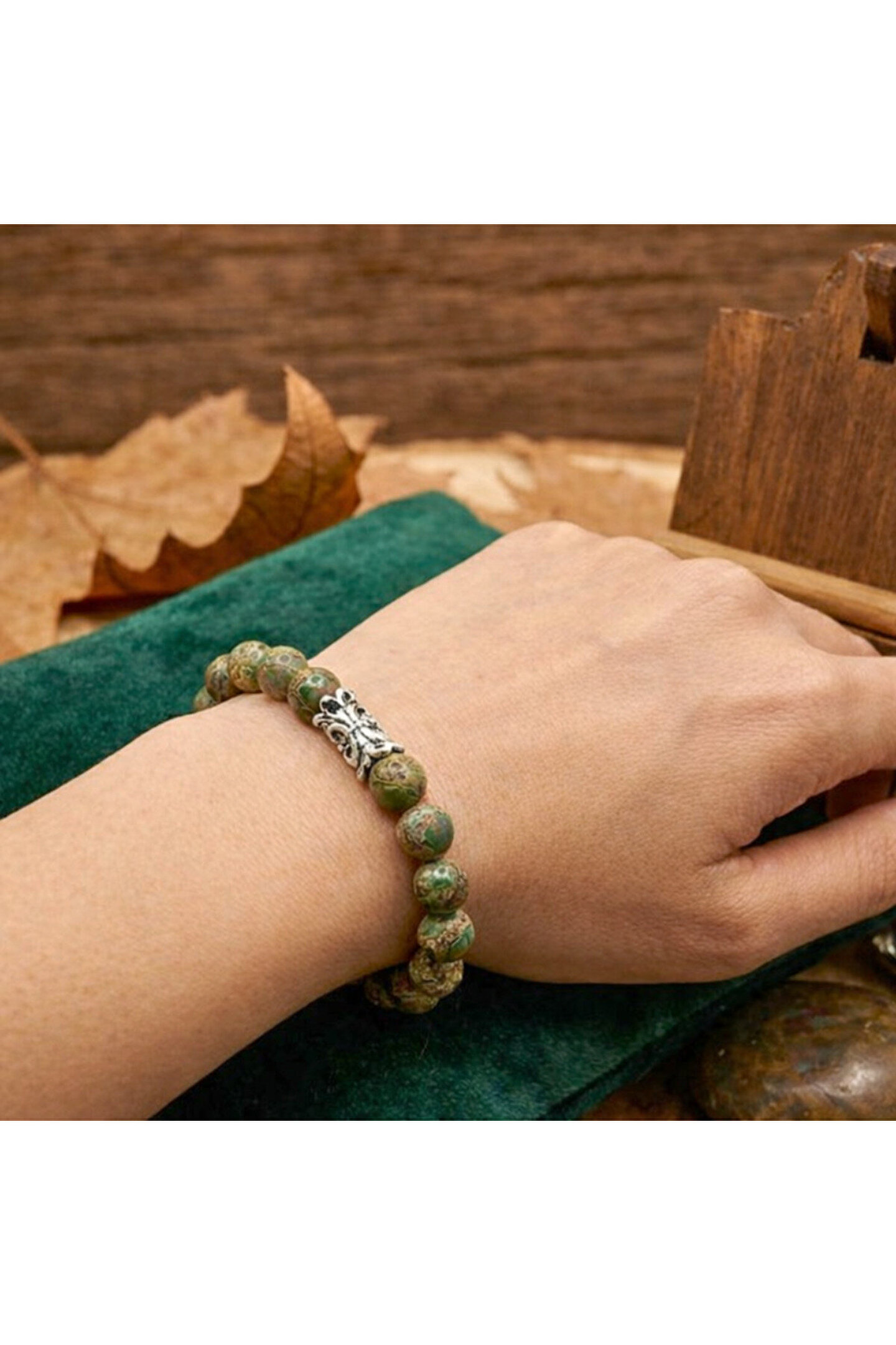 - Doğal Tibet akiği taşından üretilmiş, hem kadın hem erkeklerin rahatlıkla kullanabileceği unisex bir bilekliktir.; - Canlı yeşil rengiyle dikkat çeken bu bileklik, doğal taşın estetik güzelliğini yansıtır.; - Türkiye'de üretilmiş olup, yerel işçilik ve kaliteli malzemelerle öne çıkar.; - Bakımı kolaydır; nemli bir bezle silerek temizliği sağlanabilir.; - Standart bedeni sayesinde farklı bilek ölçülerine uyum sağlar ve rahat bir kullanım sunar.