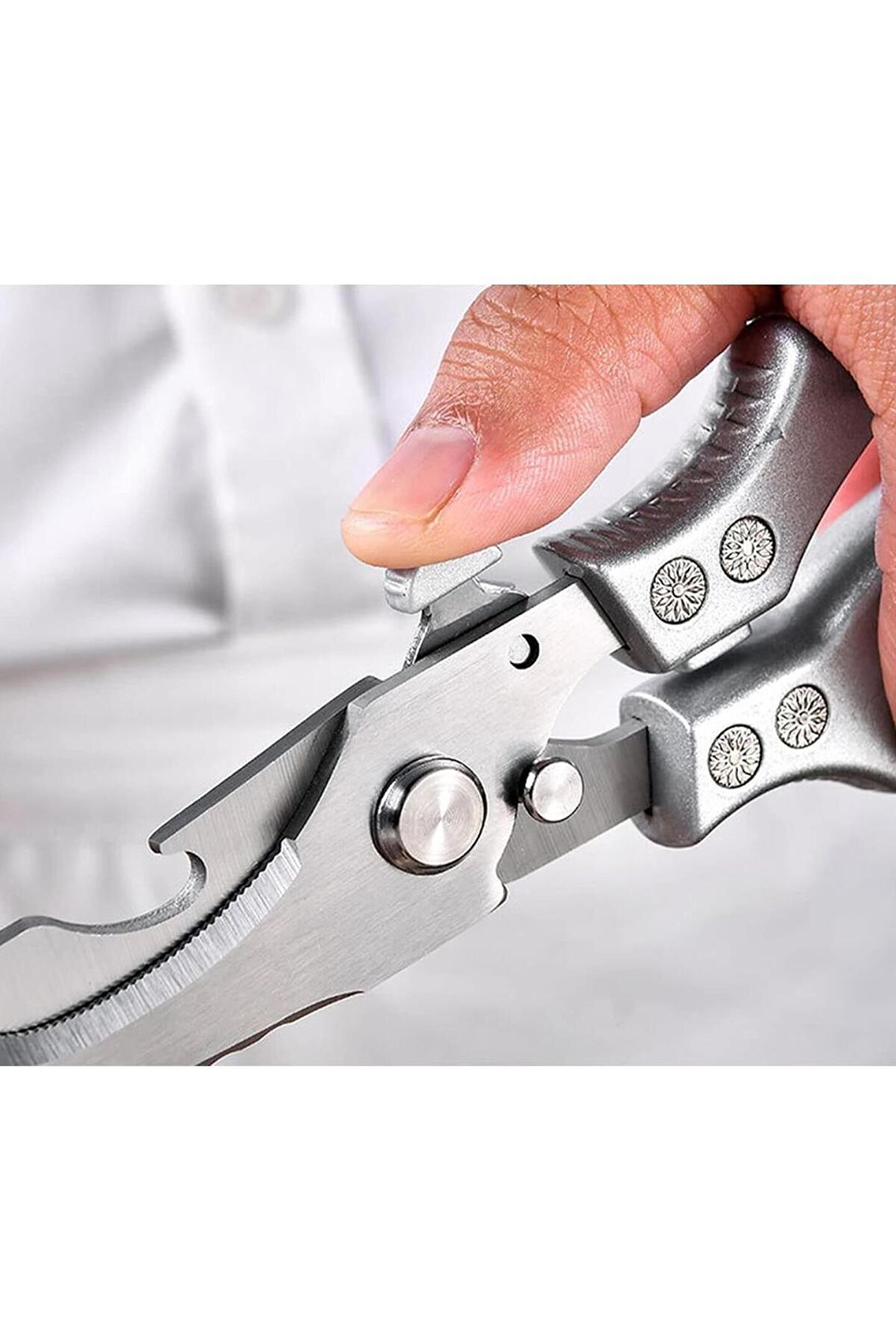 Sunup SN-26972 Tavuk Kesme - Temizleme Aparatı; Kesme kenarı tırtıklıdır, dolayısıyla kesilecek malzeme kaymaz. Bir diğer özellik ise, makasın kazara açılmamasını ve keskin kenarın ortaya çıkmamasını sağlayan küçük güvenlik kancasıdır. Bıçakları yüksek kaliteli paslanmaz çelikten yapılmıştır. Güçlü ve dayanıklıdır, kalıcı olarak keskintir. Çok kolay bir şeiklde tavuk kesilmesi ve temizlenmesi işlerini yapabilir.