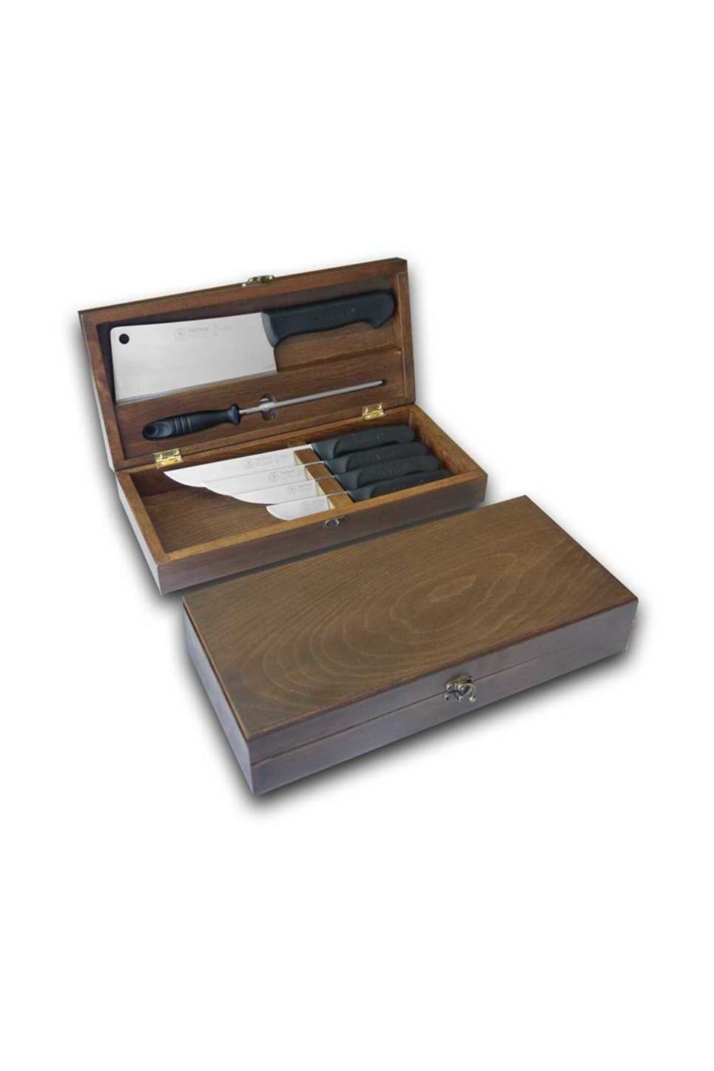 Paslanmaz çelik malzemesi sayesinde uzun ömürlü kullanım ve dayanıklılık sunar; Ahşap sandıkta gelen 6 parça bıçak seti, mutfakta ihtiyacınız olan her türlü kesim için idealdir; Çatal, bıçak, masat ve satır kurban bıçağı gibi temel bıçakları içerir, böylece çeşitli yemek hazırlama işlemlerinizde kolaylık sağlar;