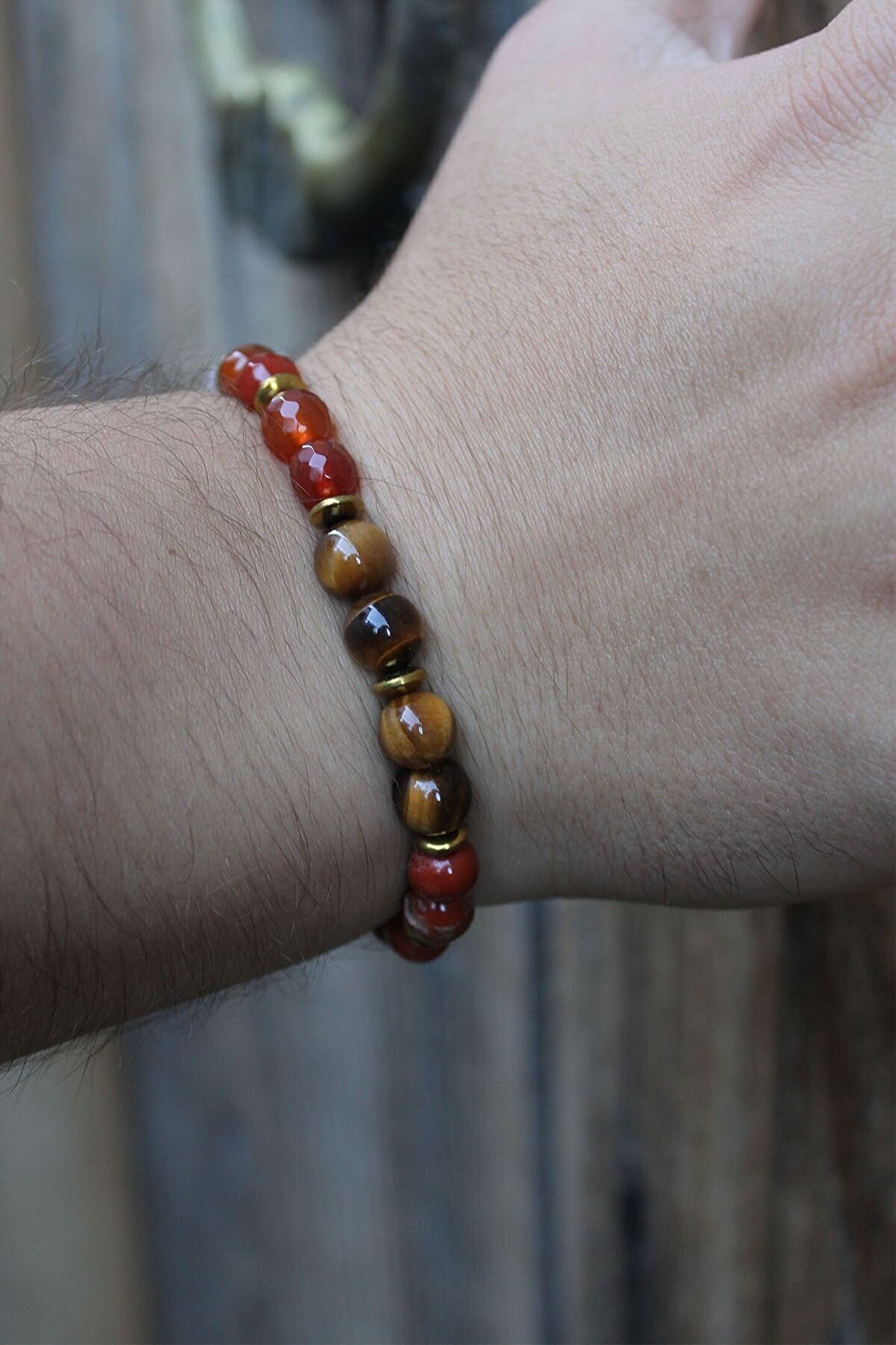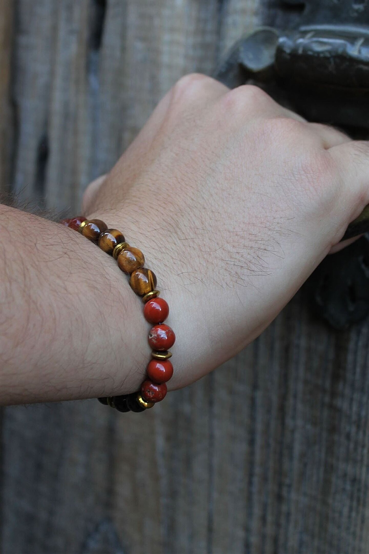 Aslan burcu kaplan gözü jasper hematit lal erkek burç bilekliği, aslan burcu özelliklerini taşıyan özel tasarımıyla dikkat çeker; Doğal taş kullanımı sayesinde her bileklik benzersiz ve otantik bir görünüm sunar; Hematit taşı, Aslan burcu kaplan gözü lal erkek burç bilekliği'ne karakteristik kırmızı tonunu verirken, jasper taşı ise dayanıklılığı ve şıklığıyla ön plana çıkar;