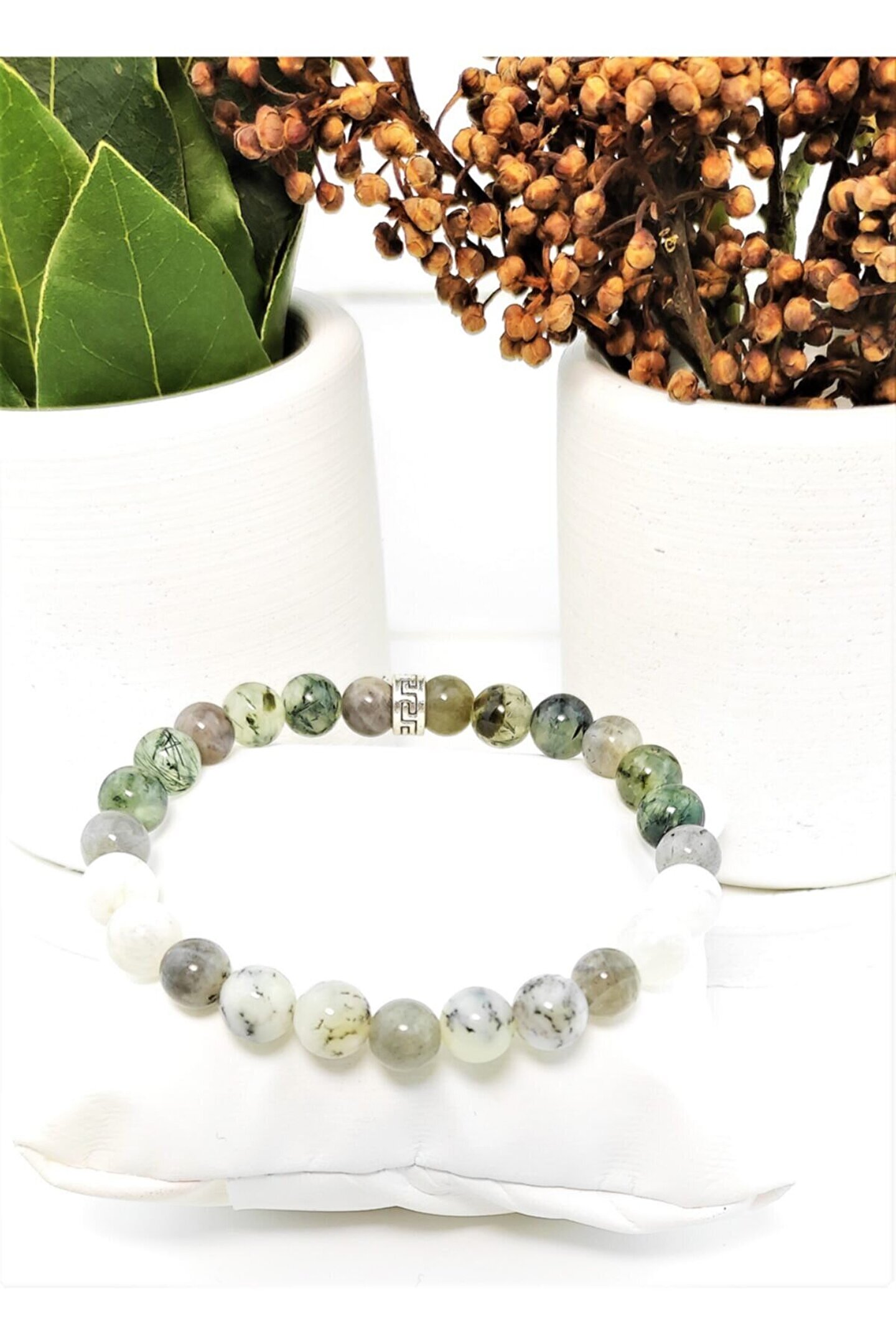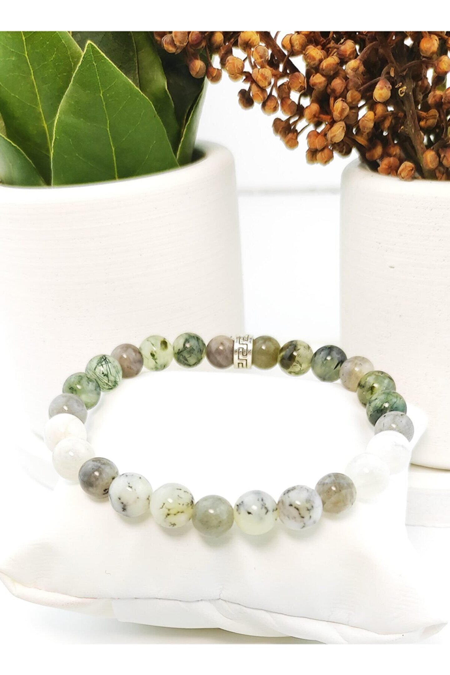 Doğal taşların eşsiz güzelliğini yansıtan prehnit dentrit opal labradorit aytaşı, her bileğe özel bir zarafet katar.; Polyester materyalden üretilmiş olup, dayanıklı yapısıyla uzun süreli kullanım imkanı sunar.; 8 mm boyutundaki boncukları ile klasik ve zamansız bir tasarıma sahiptir, her türlü kıyafetle kolayca kombinlenebilir.; Elastik yapısıyla farklı bilek ölçülerine uyum sağlar ve konforlu bir takılma deneyimi sunar.;