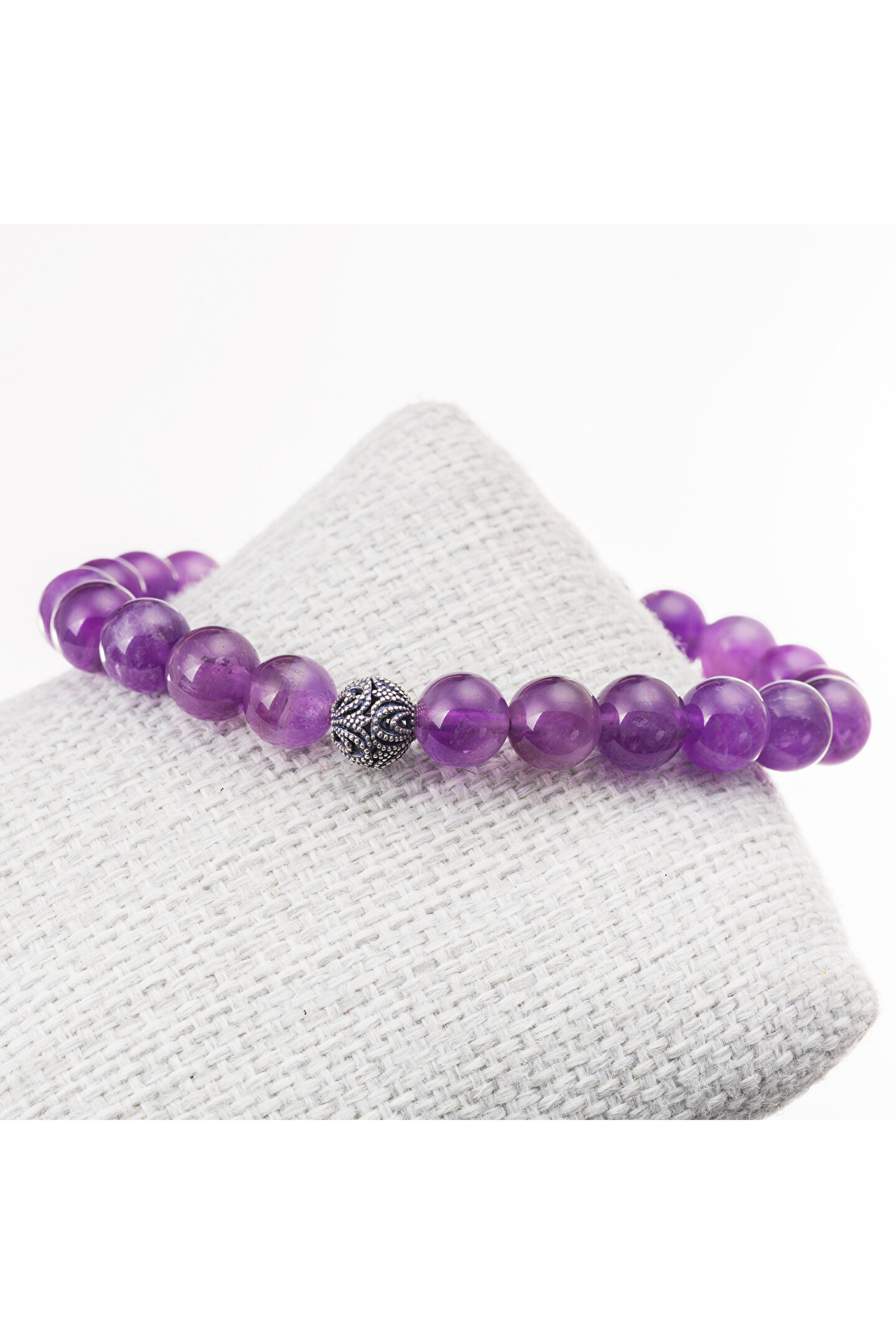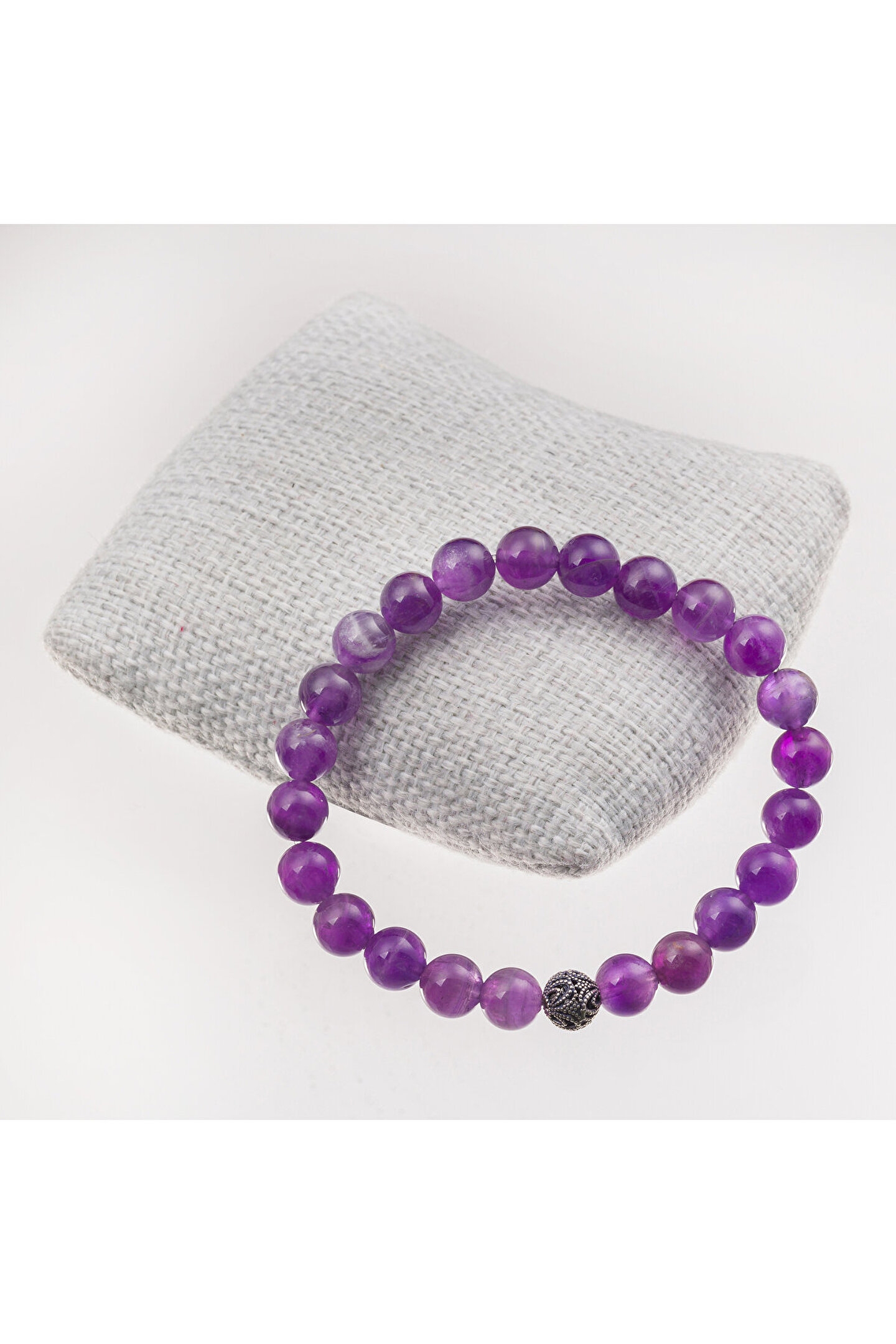 Doğal ametist taşı, gümüş bileklikte zarif bir şekilde kullanılarak şıklığınızı tamamlar; Gümüş materyal, hem dayanıklılığı hem de estetik görünümü ile dikkat çeker; 8 mm boyutundaki bu bileklik, klasik ve modern tarzı bir arada sunar;