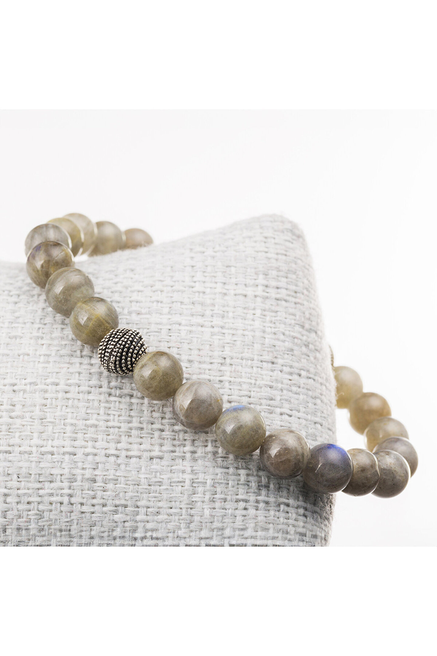 Doğal Labradorit taşı, bilekliğe zarif bir parlaklık ve şıklık katar; Gümüş materyal kullanımı, hem dayanıklılığı hem de estetik görünümü bir arada sunar; 8 mm boyutundaki tasarım, rahat bir kullanım sağlarken bileğinizin doğal hatlarını nazikçe sarar; Geleneksel ve modern tasarım anlayışını birleştiren bu bileklik, günlük kullanım için idealdir;