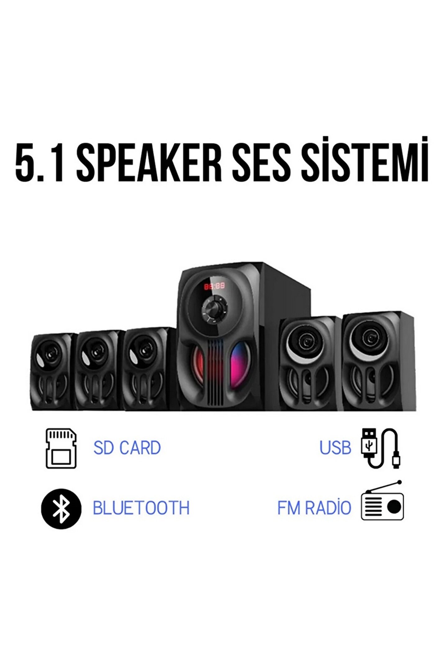 Ürün tipi:Speaker ses sistemi bağlantı: Kablolu ve kablosuz (kablosuz bağlantı türü: Bluetooth) ; Kablolu bağlantılar: Usb (usb type a, medya oynatıcı işlevi), microsd / sd ; Kanal yapısı:5.1 (5 adet uydu hoparlör ve bir subwoofer) uzaktan kumanda:Var, kablosuz ses / güç bilgileri: Ses çıkışı: 3d surround ; Güç kaynağı: Ac/dc ; Kablolu bağlantılar: Usb: Var, usb type-A, medya oynatıcı işlevi ; Kablosuz bağlantılar: Bluetooth: Var ; Multimedya: Fm radyo: Var ; Tasarım: Renk seçenekleri: Siyah ; Bu hoparlör sistemi, 5.1 kanal ses sağlar, bir subwoofer içerir, kablosuz bağlantı seçeneği (bluetooth) sunar ve bir uzaktan kumanda ile kontrol edilebilir. Ayrıca, usb bağlantısı ve medya oynatıcı işlevi, microsd / sd kart yuvası ve fm radyo özelliği bulunmaktadır. Tasarımı siyahtır. ;