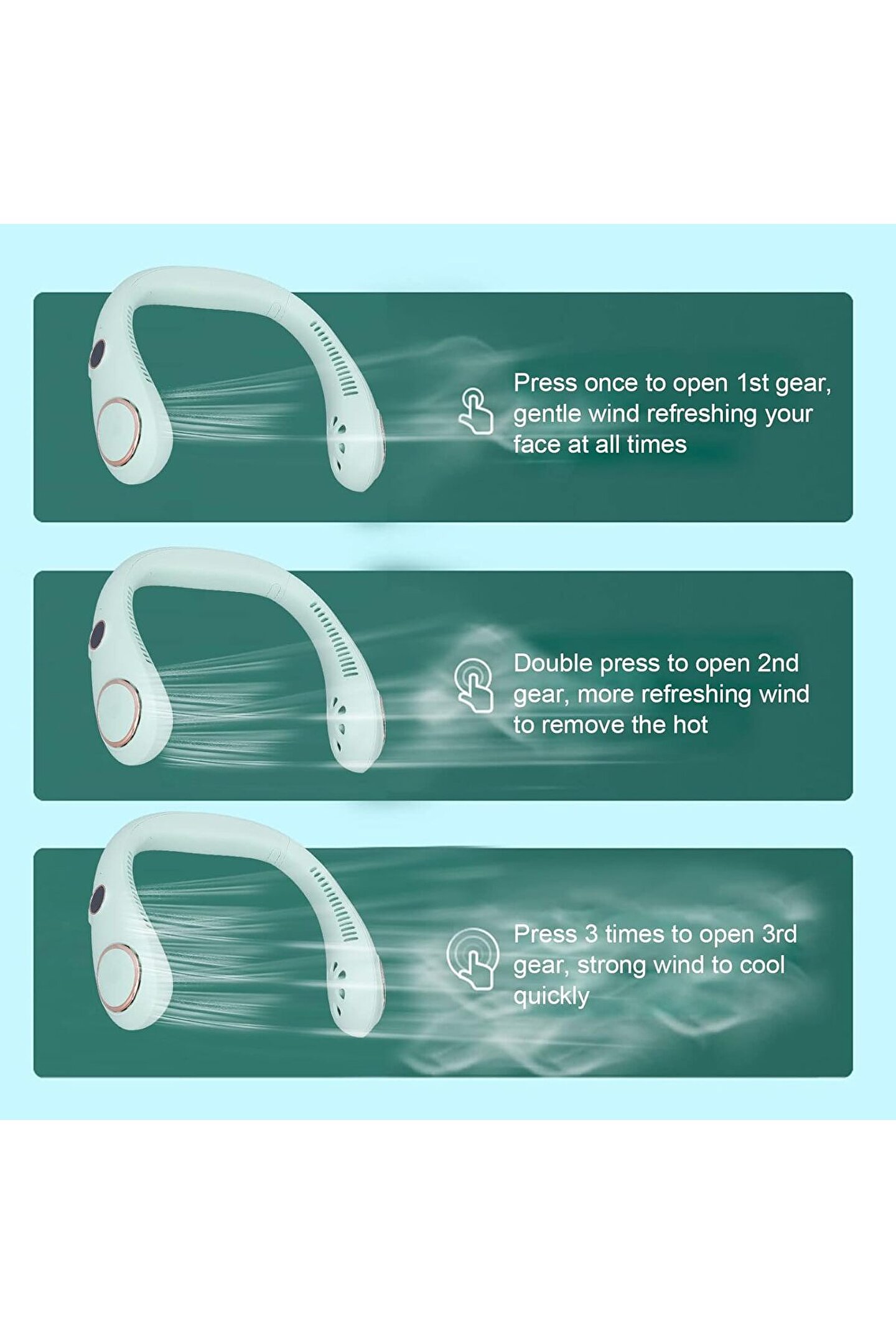 Bu boyunlu fan üç hızlı rüzgar hızına sahiptir. LED dijital ekran, gerçek zamanlı izleme, fonksiyon, dişli, güç. Yerleşik büyük kapasiteli bir batarya, düşük gürültü ve yazınıza serin bir his getiriyor.