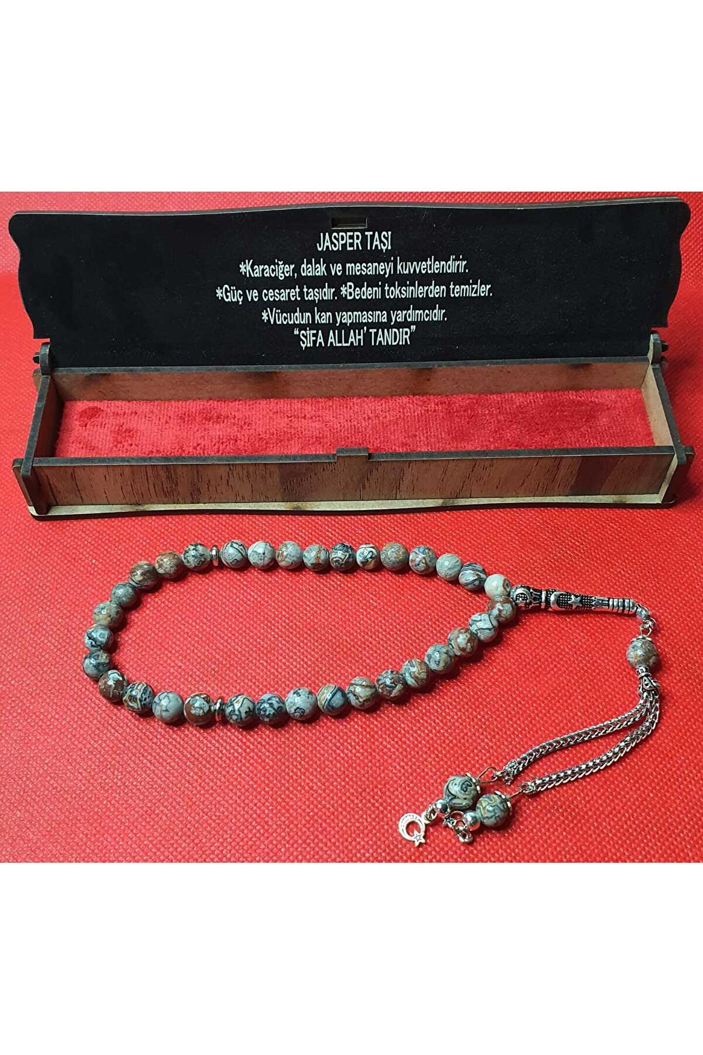 Doğal taş malzemesiyle üretilmiş, her bir tespih tanesi el işçiliğiyle özenle hazırlanmıştır; Jasper taşı kullanımı sayesinde, hem estetik hem de manevi bir deneyim sunar; 33'lük özel tasarımıyla, geleneksel tesbih ritüellerine uygunluk sağlar ve hediye olarak tercih edilebilir; Kutulu ambalajı ile sunulan bu tesbih, sevdiklerinize anlamlı bir hediye alternatifi oluşturur;