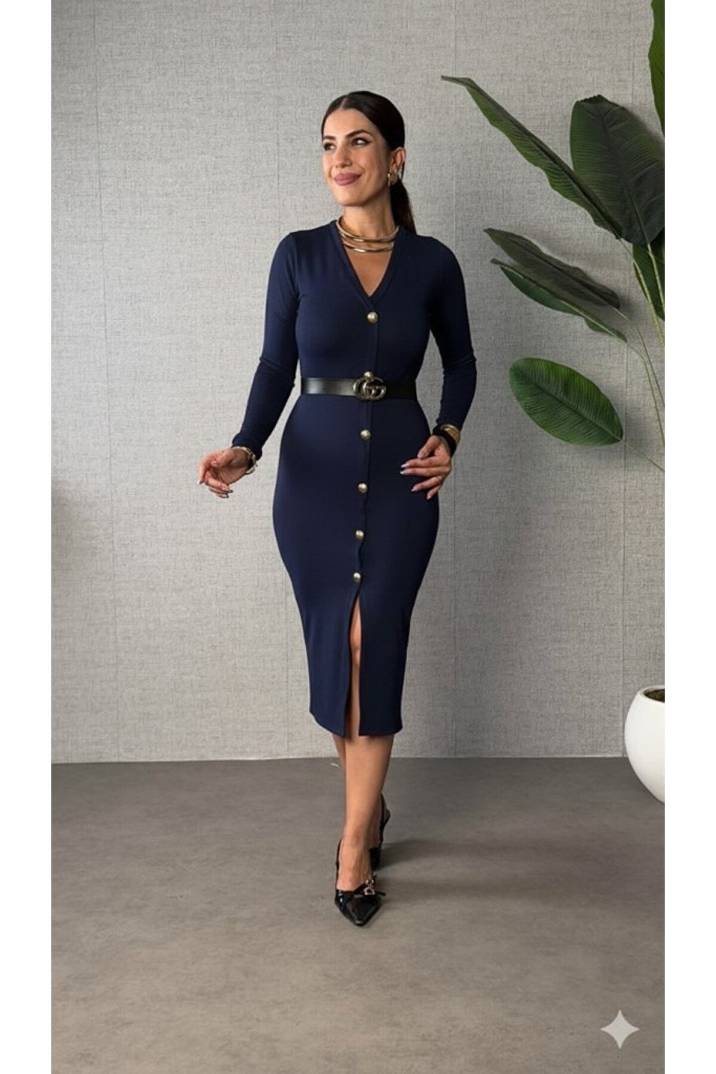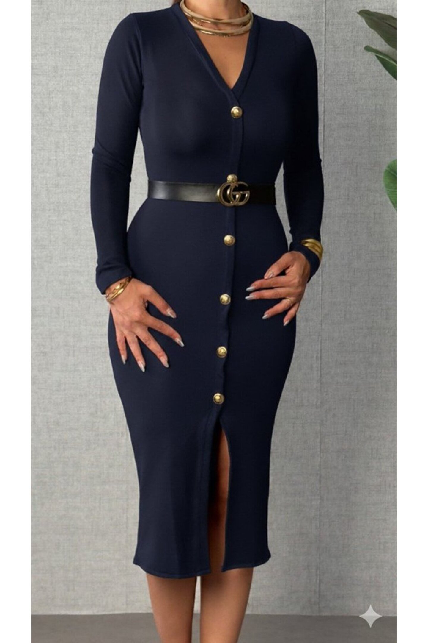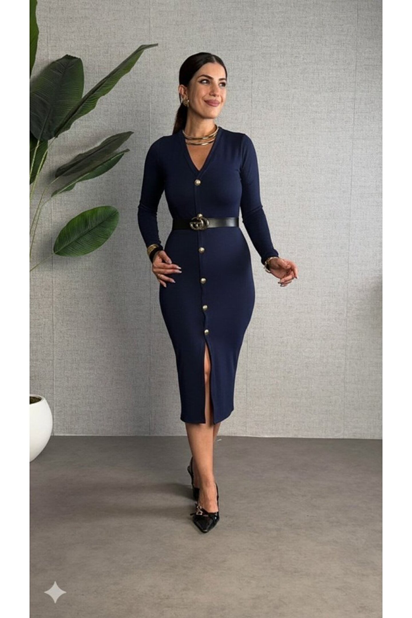 Kadın Uzun Kollu V Yakalı önden Düğmeli Yırtmaçlı Modal Midi Kemersiz Elbise