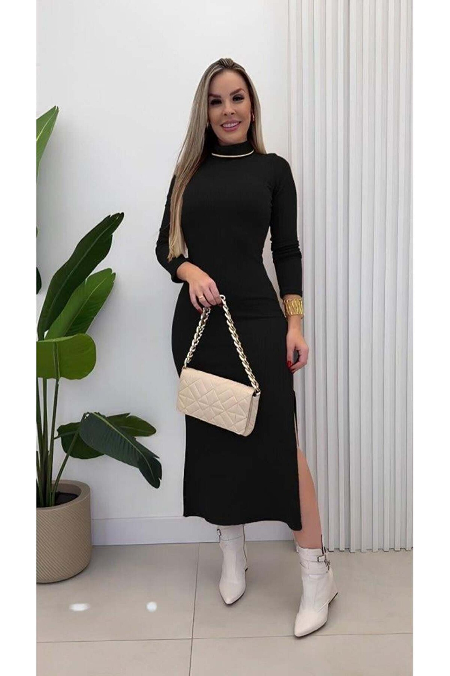 Kadın Uzun Kollu Balıkçı Yakalı Yanlardan Yırtmaçlı Kaşkorse Maxi Elbise