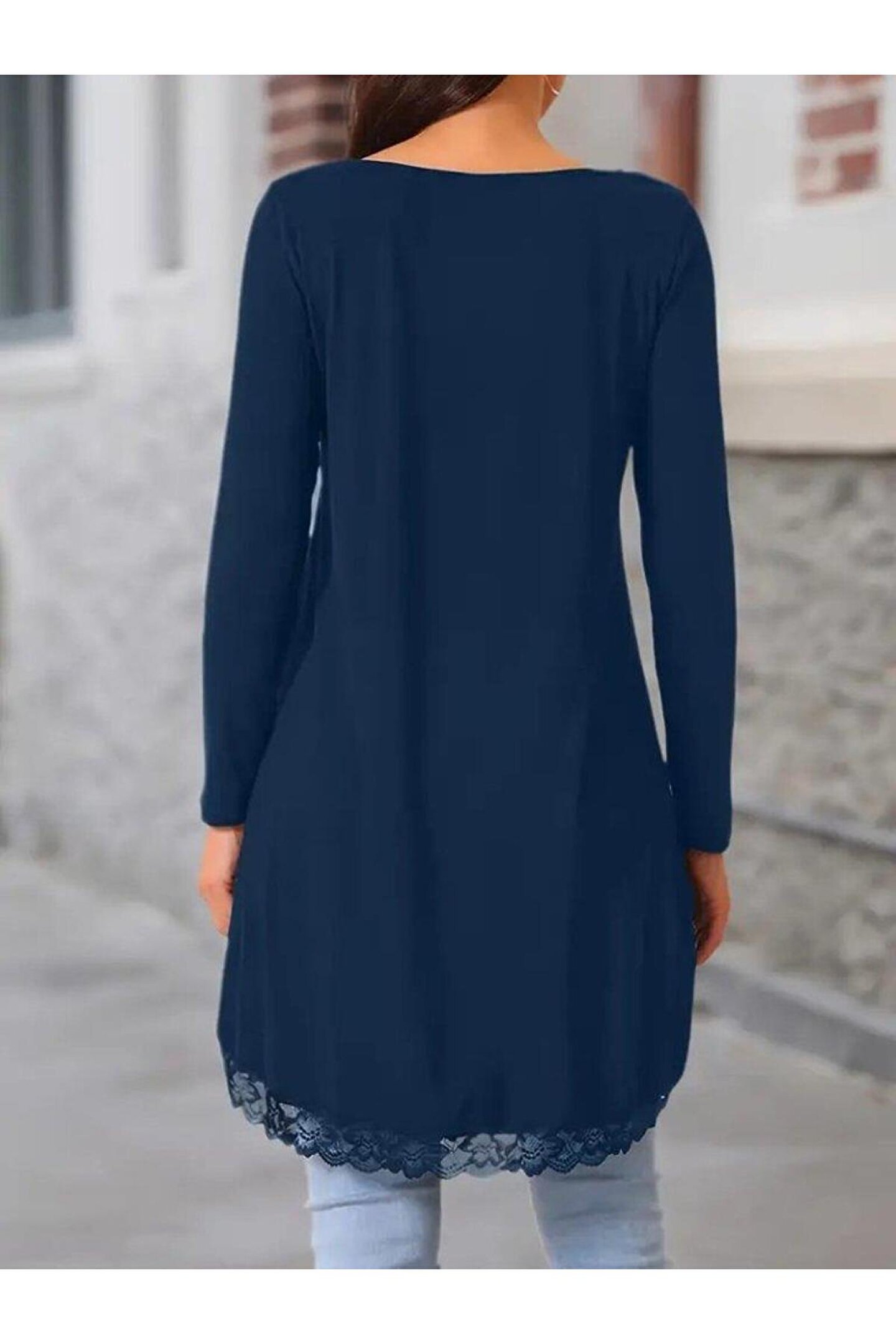 Kadın Uzun Kollu Bisiklet Yaka Asimetrik Kesim Detaylı Dantelli Viskon Bluz