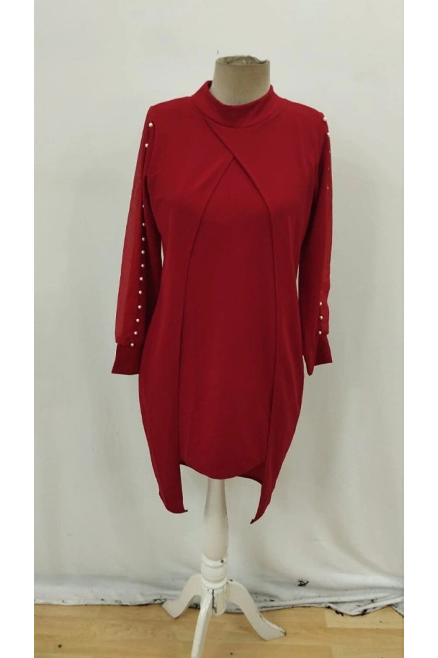Kadın Uzun Kollu Yarı Balıkçı Yaka Tül Ve Inci Detaylı Kısa Ithal Krep Midi Elbise
