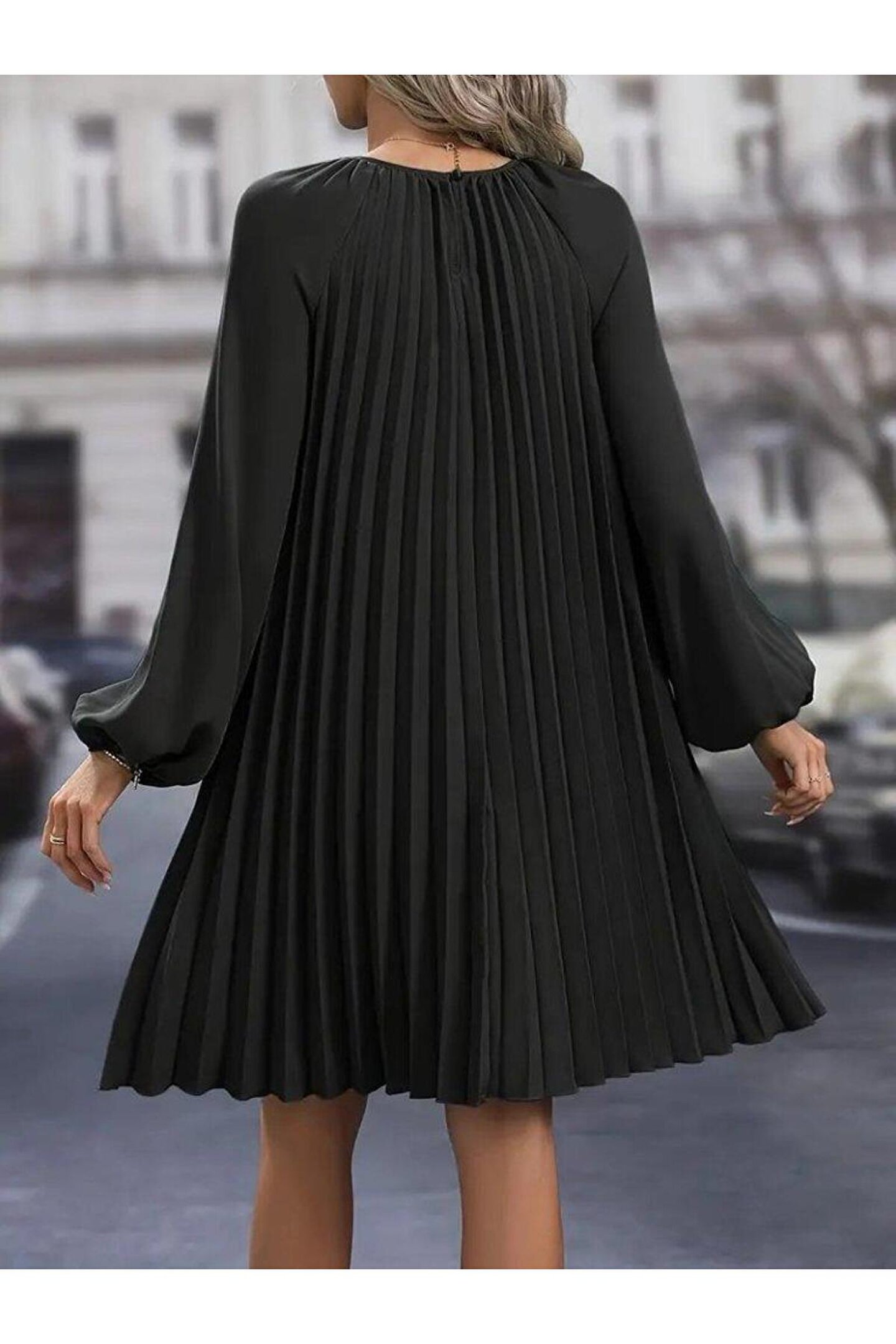 Kadın Uzun Kollu Yuvarlak Yaka Pileli Salaş Mini Ithal Krep Elbise