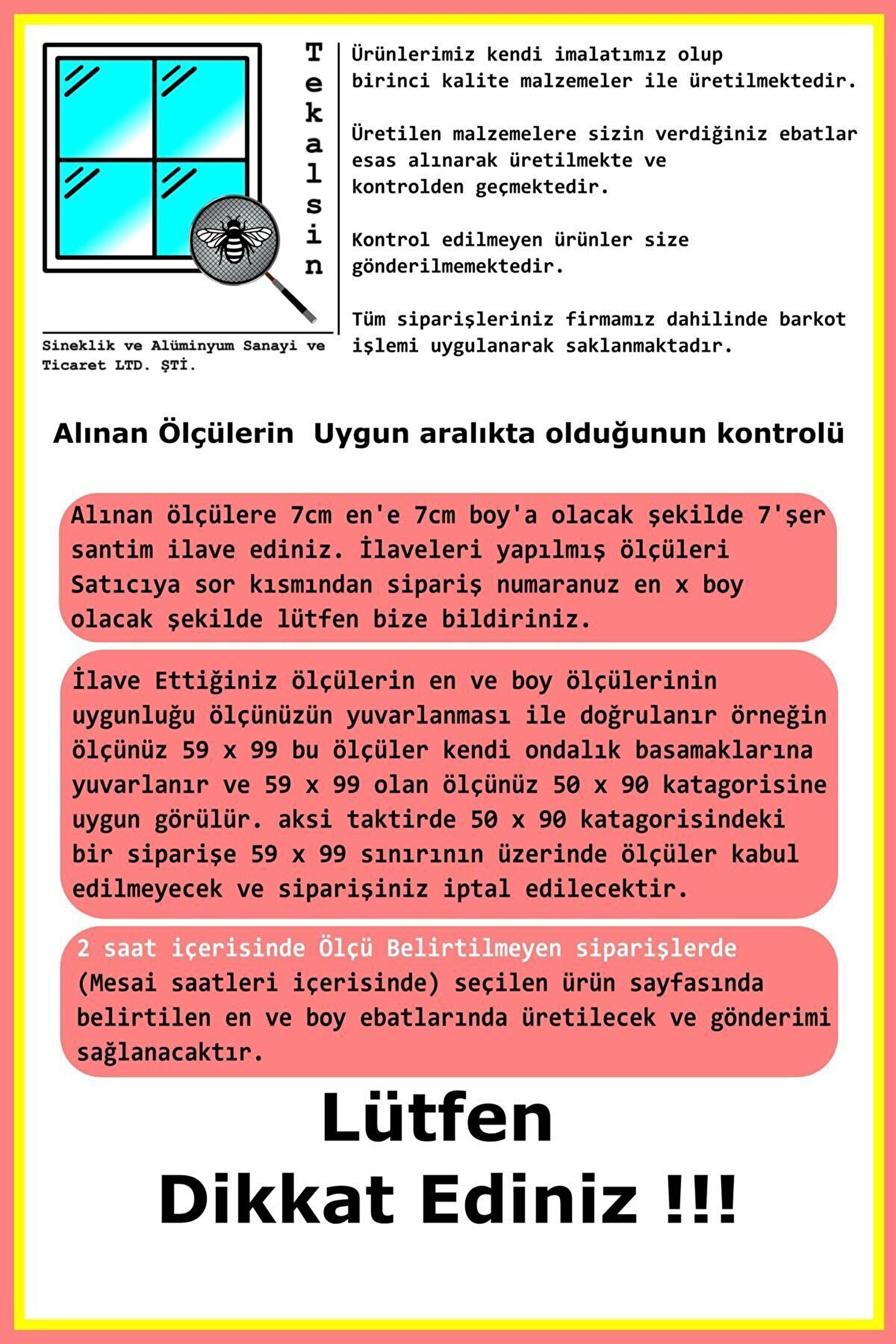 Ürün Patili dostlarımıza karşı korunaklı değildir.Tül Standart plise tülü olup güneşe ve suya karşı dayanıklıdırÜrünlerimiz kendi imalatımız olup 12 ay ip ve tül garantilidir.Ürünlerimizde kullanılan plastik aksesuarlar kesinlikle hurda malzemeden üretilmiş ürünler değildir tamamen sıfır malzemeden üretilmiş kaliteli pilastiklerdir.Dış etkenlerden olışabilecek deformasyonlar hariç kendiliğinden oluşabilecek deformasyonlar firmamız tarafından karşılanacaktır. ; Kullanım hataları garanti kapsamına dahil değildir. ; Ürün içeriğimizde istenilen miktar ve belirtilen ebatlarda satın alınan ürün, kurulum şeması, kullanım talimatları ve garanti belgesi bulunmaktadır. ; Ürün ile birlikte montaj için yeterli miktarda vida gönderilecektir. ; Kargoda hasar almış ürünleri lütfen teslim almayınız !!!Kurulum ve montaj işlemi için teknik destek sunulmaktadır.7/24 teknik destek. ; 1.Sınıf Suya ve Güneşe Karşı Dayanıklı Tül1.Sınıf paraşüt İpiKontrol Edilmiş ve Test Edilmiş Ürün12 ay ürün garantisiSineklik tüllerimiz'de kullanılan kuş gözleri paslanmaz metal malzeme ile yapılmaktadır. ; Garanti Kapsamı Gereksinimleri: Ürün size ulaştığı andan itibaren garanti süresi başlar. ; Ürünün paket açılımı video ile yapılmalıdır ve ürünün kargoda hasar almamış olması gerekmektedir. ; Eğer kargo hasarı yok ise ve ürün açıldıktan sınra iplerde kopma, köşelerde kırık, tülde yırtılma gibi ürünün çalışmasını engelleyecek kusurlar mevcut ise lütfen garanti belgesi üzerinden yazan servis ile irtibata geçiniz. ; Bu durumların dışarısında kedi, köpek gibi patili dostlarımızın oluştura bileceği hasarlar garanti kapsamında değildir. ; Ürünü garantiye gönderirken fatura ve garanti belgesi ile gönderilmelidir. ; Gönderilecek fatura ve garanti belgesi fotokopi olarak gönderile bilir.;