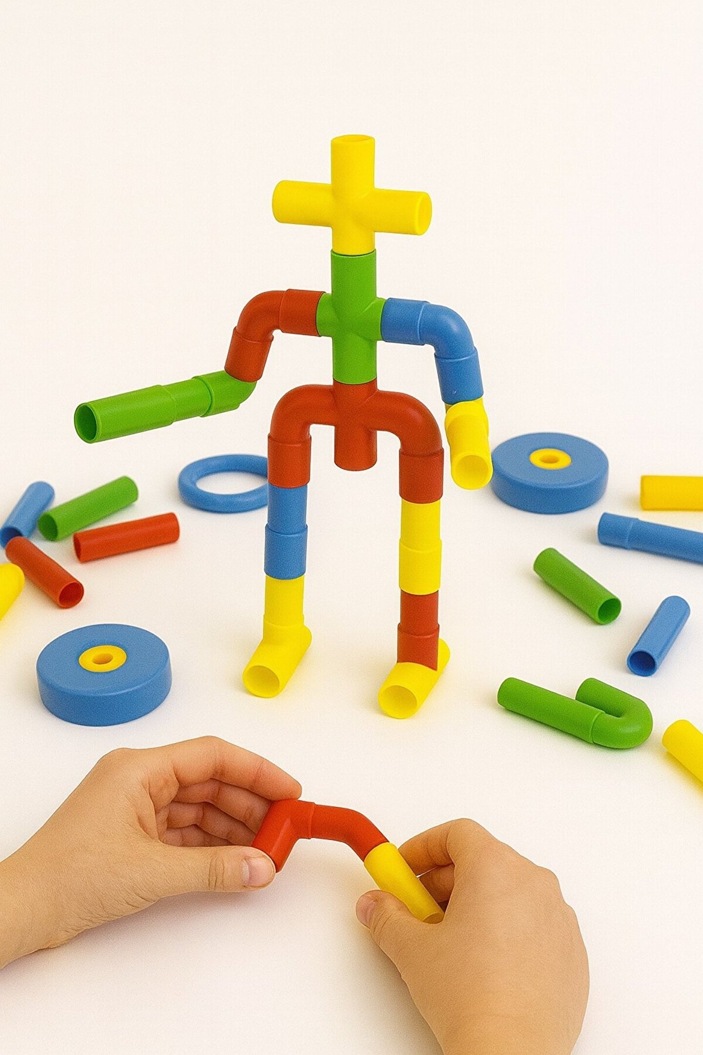 Bağla, Birleştir, Tasarla! Hayal Gücünü İnşa Eden Bağlantı Oyunu Tako Boru, çocukların hayal gücünü çalıştıran bir yapı-kurma ve bağlantı oyunudur.; Renkli boru parçaları ile araba, hayvan, robot, köprü gibi sınırsız modeller tasarlanabilir.; Hem motor becerileri hem de görsel düşünmeyi en eğlenceli şekilde geliştirir!