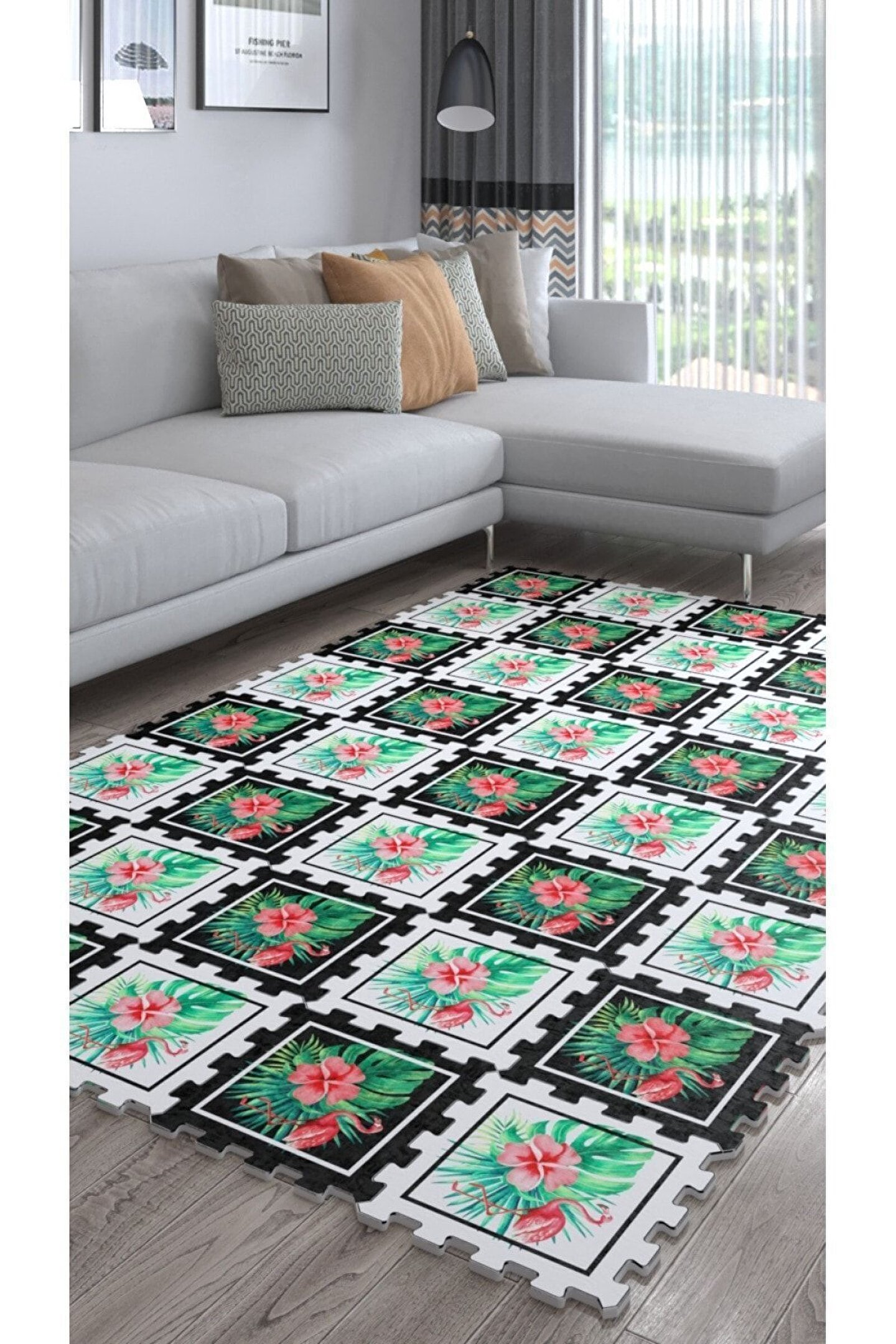 Tokyo Halı Çiçek Desenli Yıkanabilir Dekoratif Salon Halısı Ths9 | Yapboz Halı | Puzzle Halı