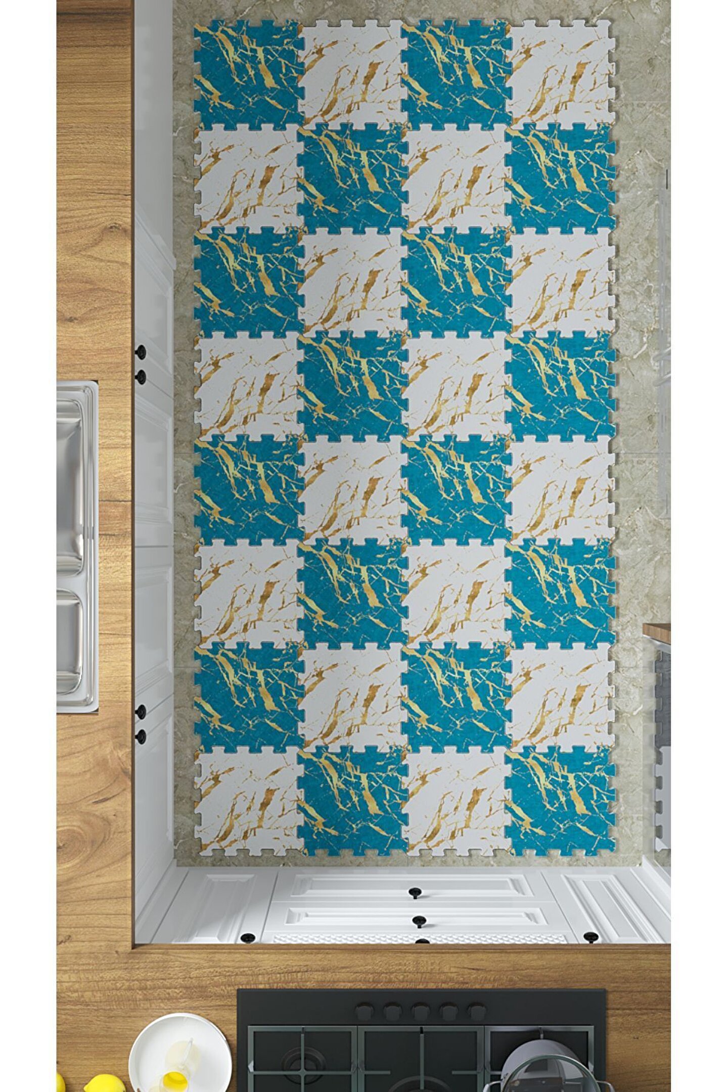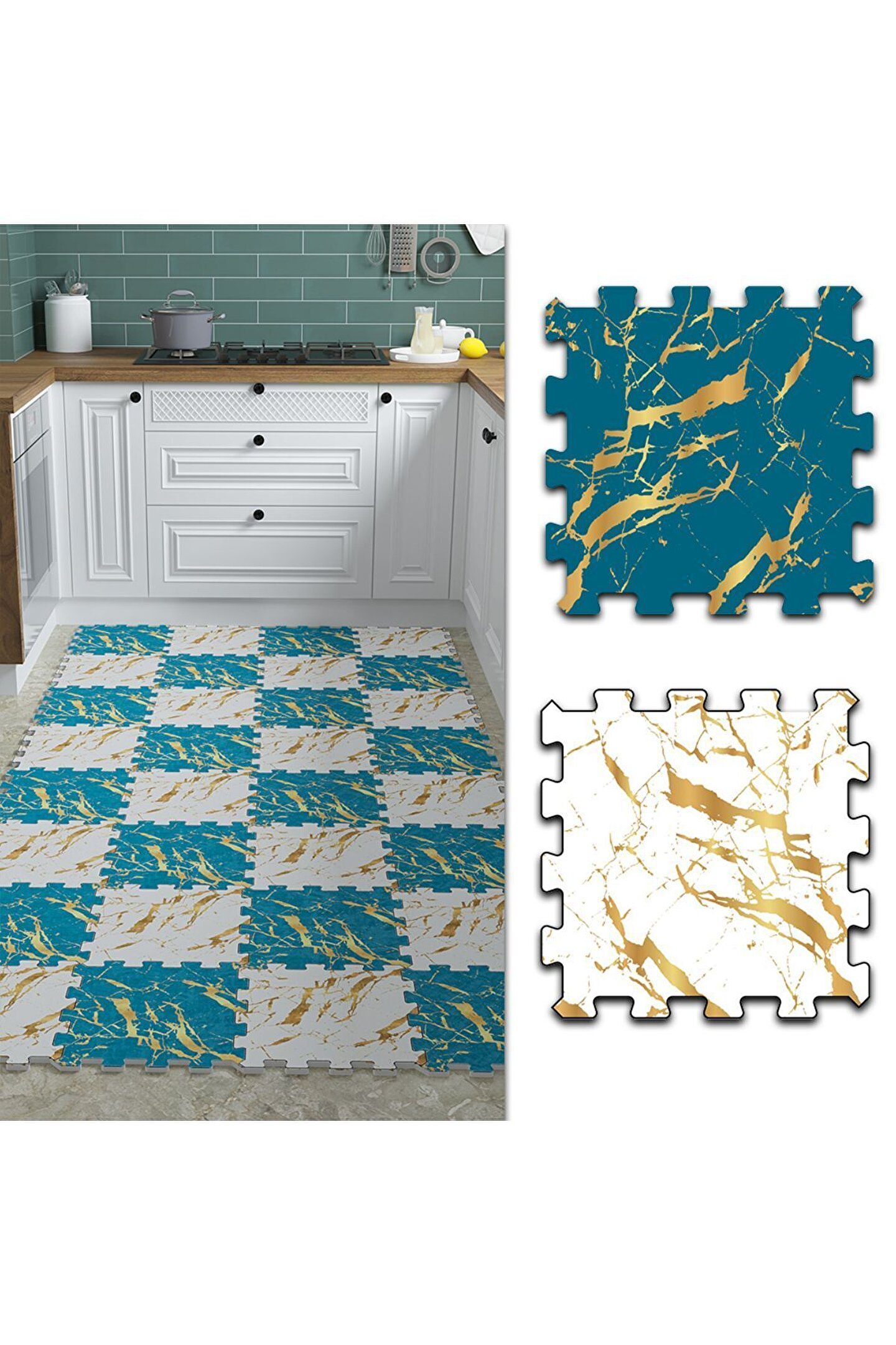 Tokyo Halı Mavi Beyaz Mermer Desenli Mutfak Halısı Thm27 | Yapboz Halı | Puzzle Halı