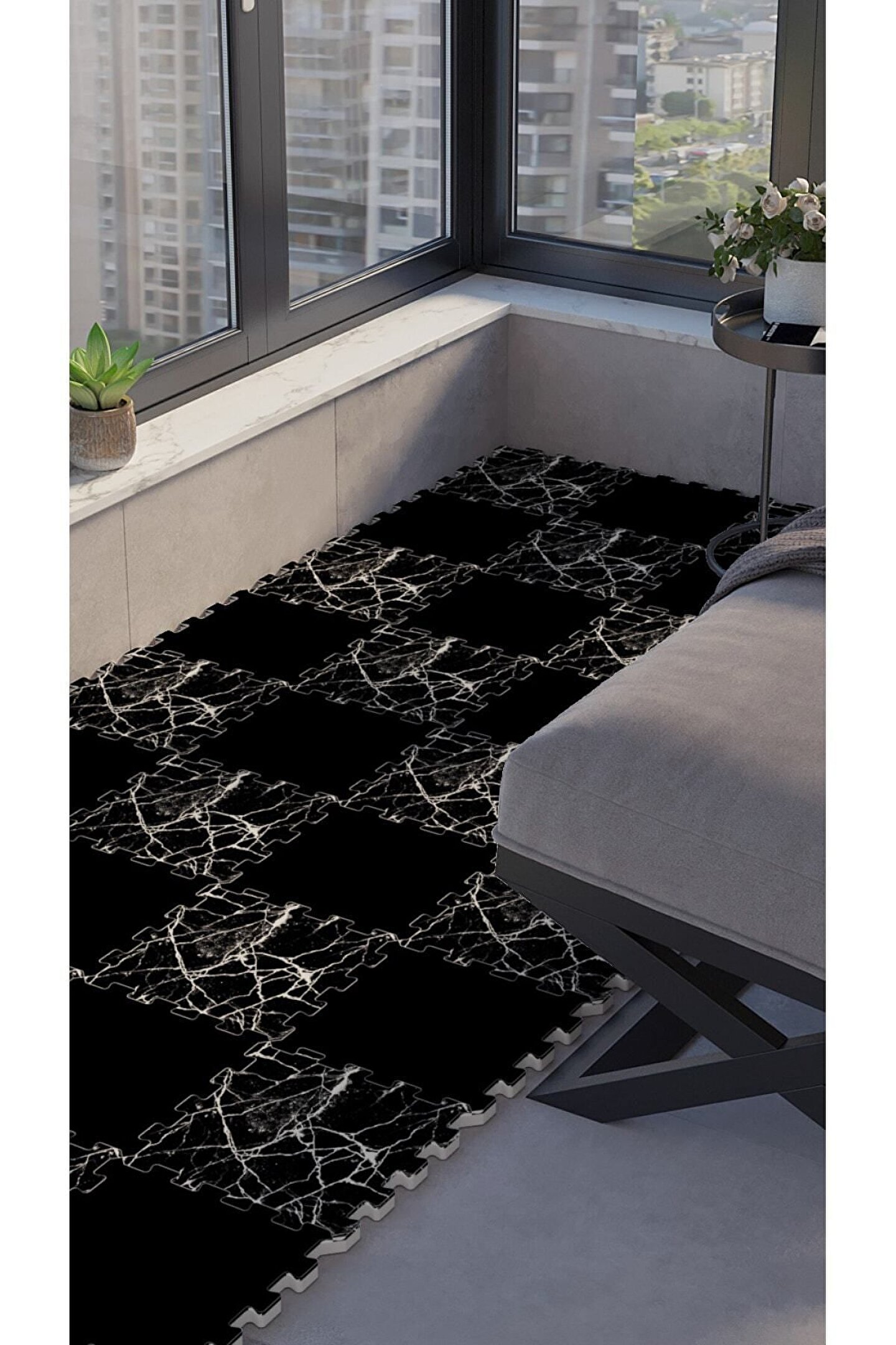 Tokyo Halı Siyah Mermer Desenli Su Geçirmez Balkon Halısı Thb30 | Yapboz Halı | Puzzle Halı