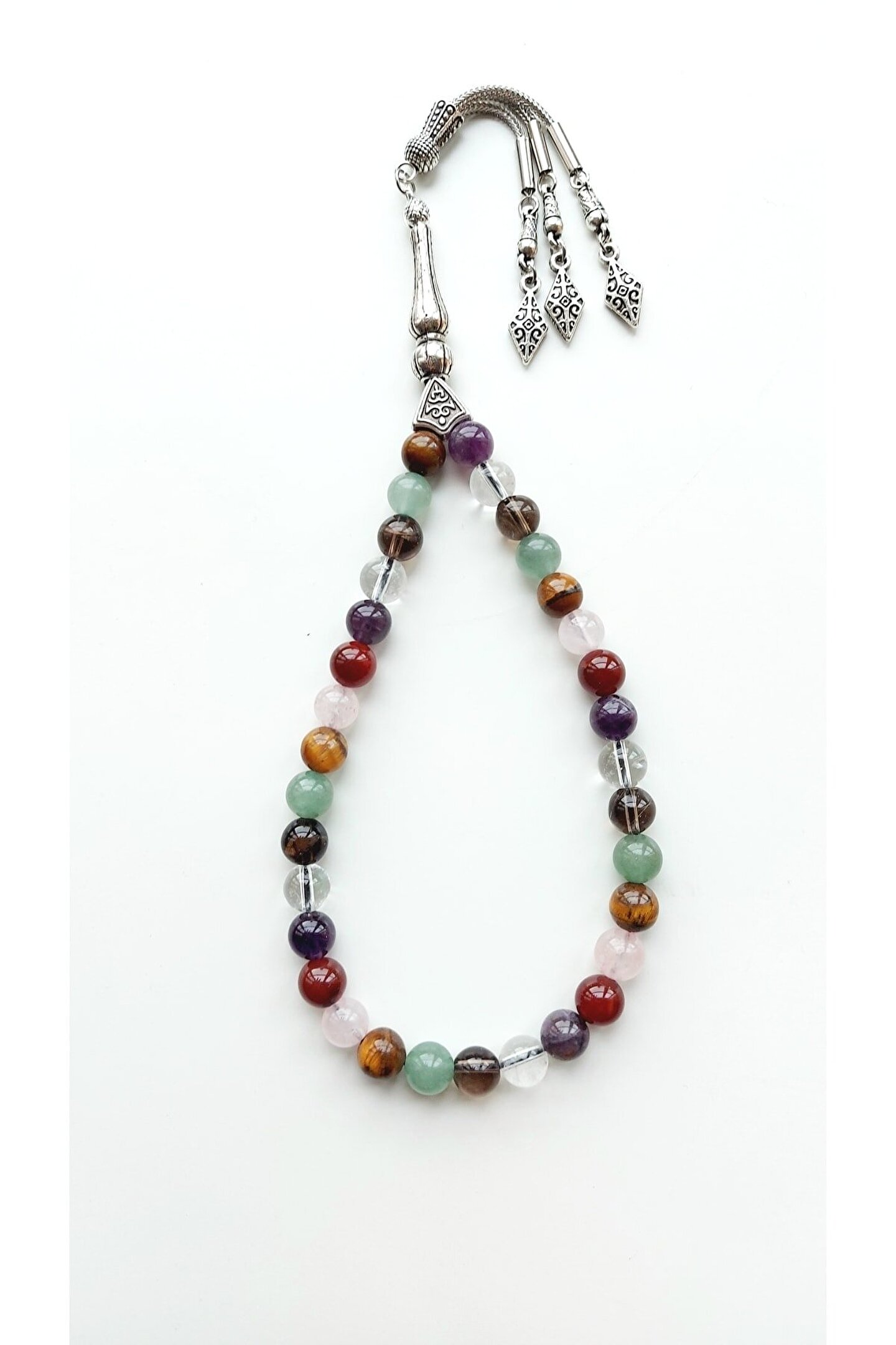 Doğal taş kullanımı sayesinde, her bir tesbih taşı benzersiz bir enerji ve şıklık sunar; 7 çakra tesbih, meditasyon ve manevi uygulamalarınızda size rehberlik ederken, aynı zamanda estetik bir görünüm sağlar; Doğal taş materyali ile hem doğanın güzelliklerini hem de ruhsal dengeyi bir arada yaşatır;