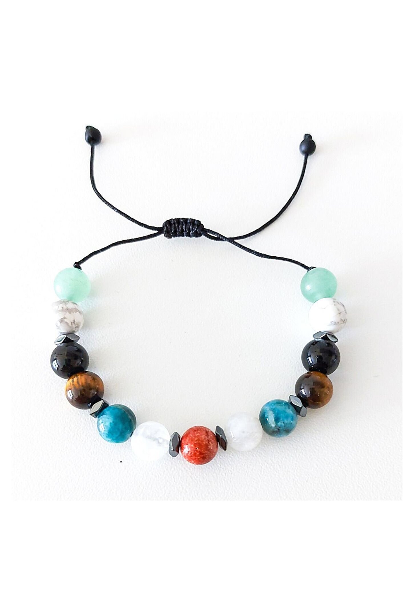 Orijinal doğal taşlar kullanılmıştır. ; Kullanılan taşlar : Apatit, Ay taşı, Kırmızı Jasper, Oniks, Havlit, Aventurin, Kaplangözü, Hematit. ; Bileklik, asansörlü ve ayarlanabilirdir. ; Her Ölçüye Uygundur. ; Dayanıklı paraşüt ipinden imal edilmiştir. ; Bilekliğin Özellikleri: Metabolizma hızlandırma ve yağ yakımı, Tokluk hissi ve iştah azalması, İştah kapatma ve kesici, Alışkanlık bırakma, Stres, Depresyon ve uykusuzluk, Nazar, Kaygı ve korku yenme, Migren ve ağrı azaltma, Kemik ve Cilt Sağlığı. ; Bileklik de kullanılan doğal taşlar, iştah keserek, alışkanlıkları bırakmayı sağlayacak enerjilerle birlikte metabolizma hızını yükselterek, yağ yakımı ve kilo vermeye neden olurken, eğer istenirse, Kısa zamanda daha iyi sonuç almak için, İştah kapatıcı zayıflama bileklik birlikte, beslenmeye dikkat edilmesi ve günlük hareketlilik için yürüyüş yapılması halinde çok kısa sürede iyi sonuç alınır. ; Kullanım bilgisi ürün ile birlikte gönderilmektedir.;