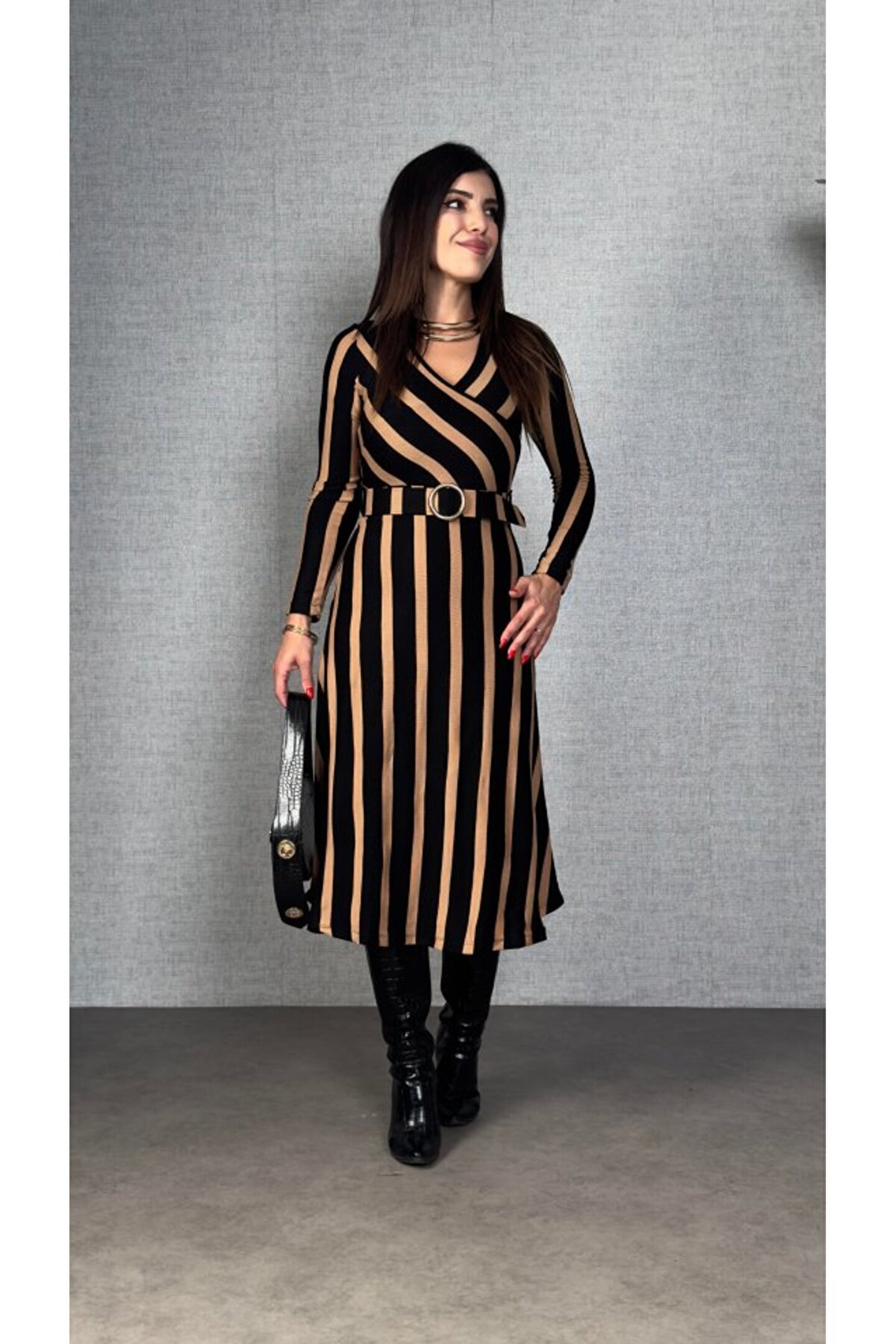 trend_ermege EQURİ Kadın Uzun Kollu Kruvaze Yaka Kemer Dahil çizgili Triko Elbise