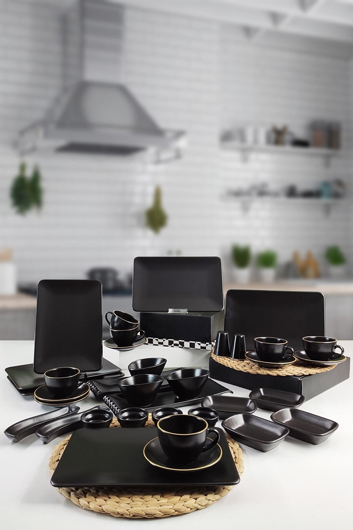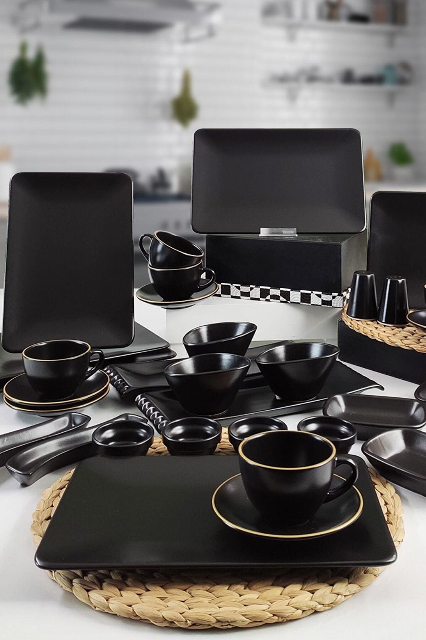 35 parça kahvaltı takımı içeriği 6 adet siyah mat 31*21cm dikdörtgen servis tabağı ; 6 adet siyah mat altın yaldızlı çay fincanı ; 6 adet siyah mat altın yaldızlı çay tabağı ; 4 adet siyah mat 7cm joker kase ; 4 adet siyah mat 13cm dikdörtgen kayık ; 3 adet siyah mat 12cm miska kase ; 2 adet siyah mat ıvory zeytinlik ; 2 adet siyah mat 33cm selen kayık ; 1 adet siyah mat tuzluk ; 1 adet siyah mat biberlik ;
