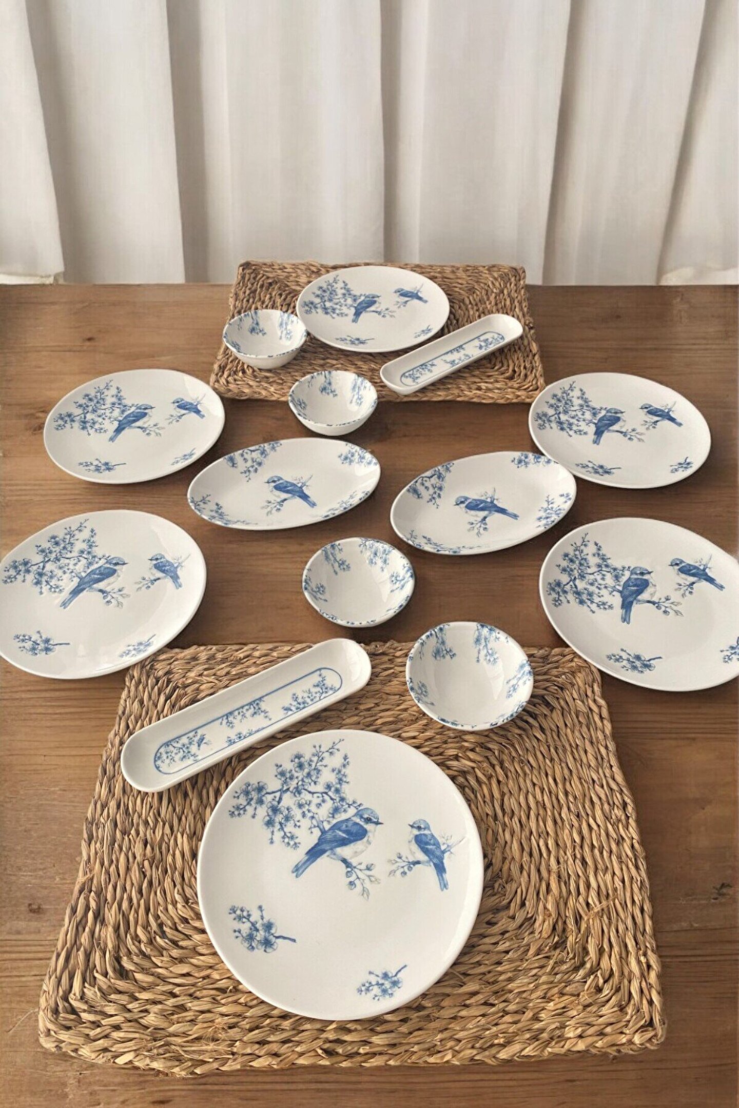 6 adet 20cm porselen kahvaltı tabağı ; 4 adet 10cm porselen kahvaltılık kase ; 2 adet 20cm porselen zeytinlik ; 2 adet 21cm porselen kayık tabak ;