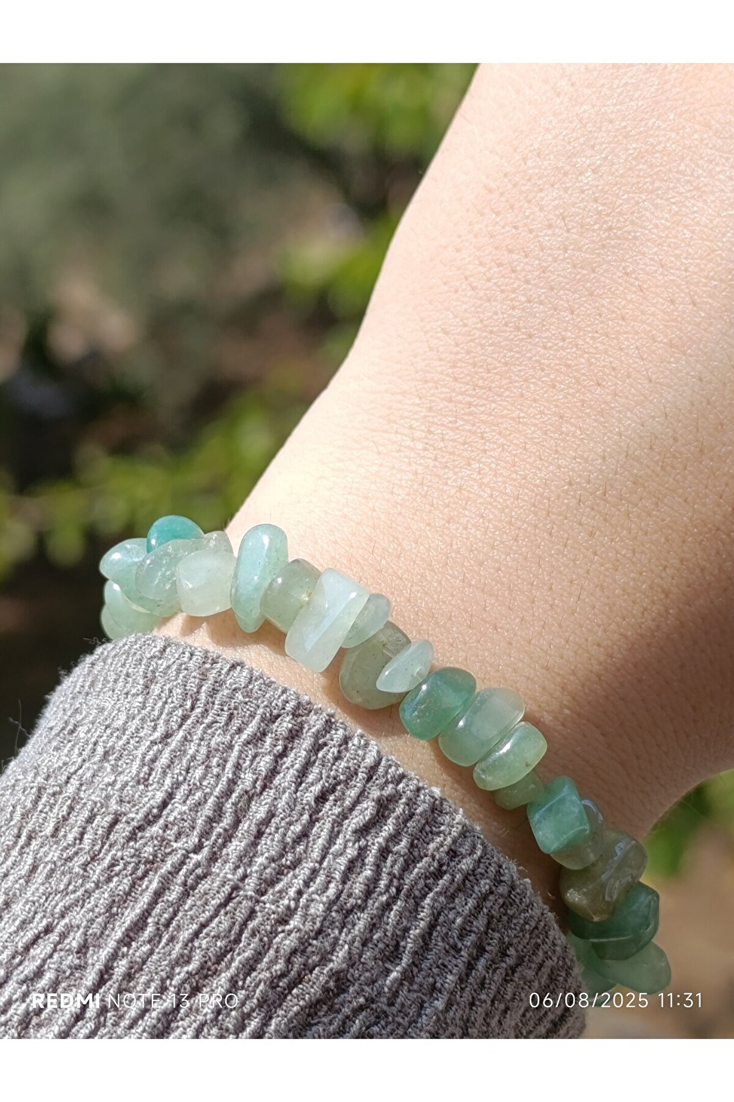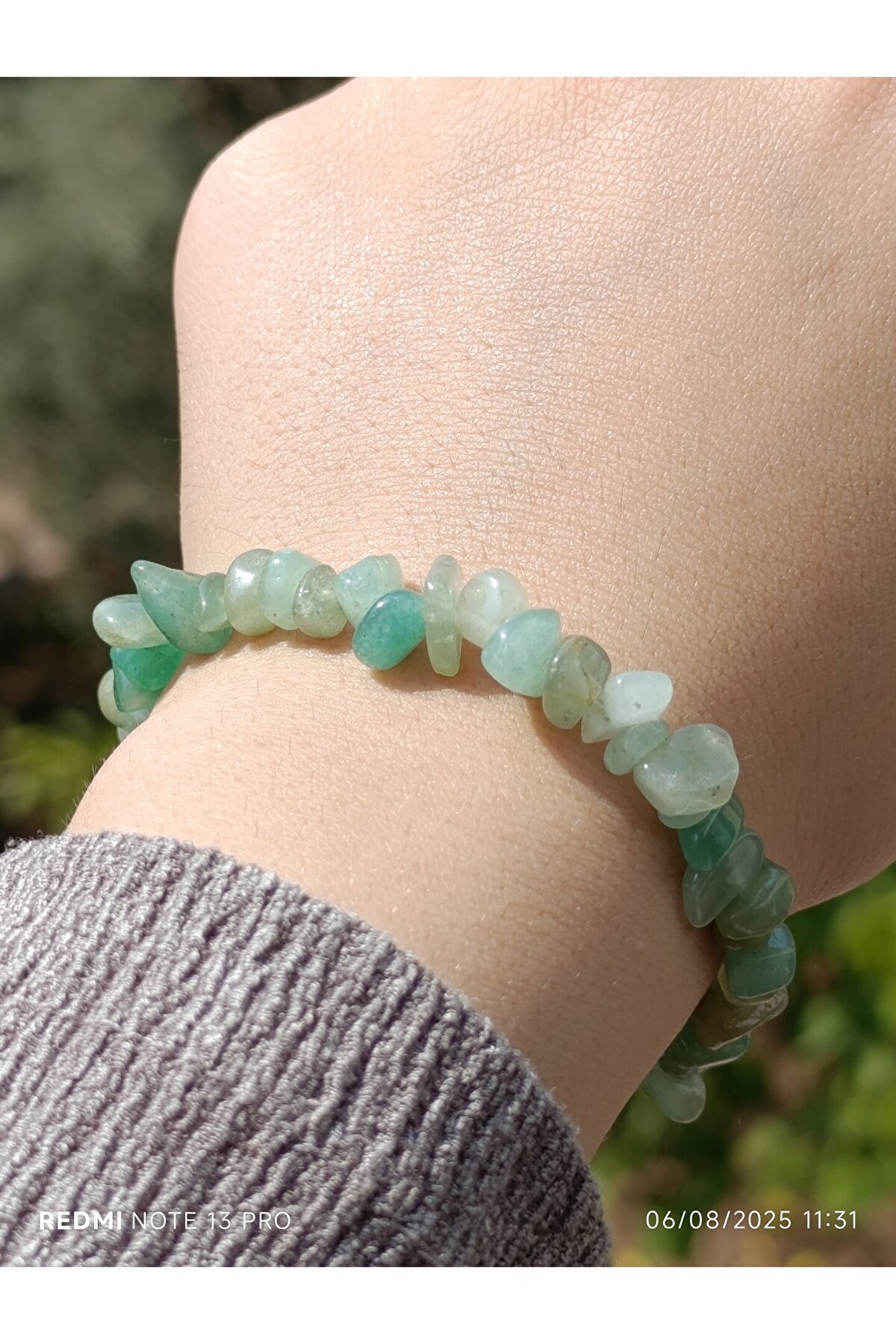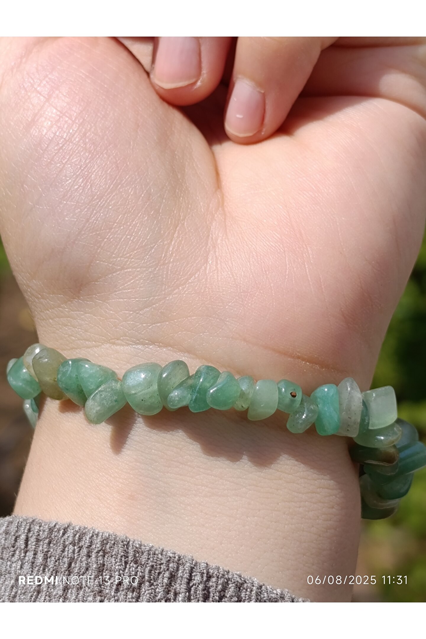 * Malzeme: %100 doğal, kırık aventurin taşları kullanılarak el yapımıdır.; Her bir bileklik, taşların eşsiz ve doğal formu sayesinde benzersizdir.; * Özellikleri: Aventurin, şans ve bolluk taşı olarak bilinir.; Kullanıcısına pozitif enerji, iç huzur ve duygusal denge getirdiğine inanılır.; Kalp çakrası ile uyumlu çalışarak sevgi, affetme ve şefkat duygularını güçlendirebilir.; * Tasarım: Estetik ve sade bir tasarıma sahiptir.; Bileklik, ayarlanabilir yapısı sayesinde her bilek ölçüsüne rahatlıkla uyar ve günlük kullanıma uygundur.; Kırık taşların doğal ve rustik görünümü, ürüne otantik bir hava katar.; * Kullanım: Hem kadınlar hem de erkekler için idealdir.; Günlük kıyafetlerinizle kolayca kombinleyebileceğiniz gibi, özel anlarda da enerjisiyle size eşlik edebilir.; Sevdikleriniz için anlamlı ve özel bir hediye seçeneğidir.; * Bakım: Doğal taşların enerjisini temizlemek için ayda bir kez adaçayı tütsüsüyle arındırabilir veya akan su altında kısa bir süre bekletebilirsiniz.; Kimyasal maddelerden ve aşırı sıcaklıktan uzak tutulması tavsiye edilir