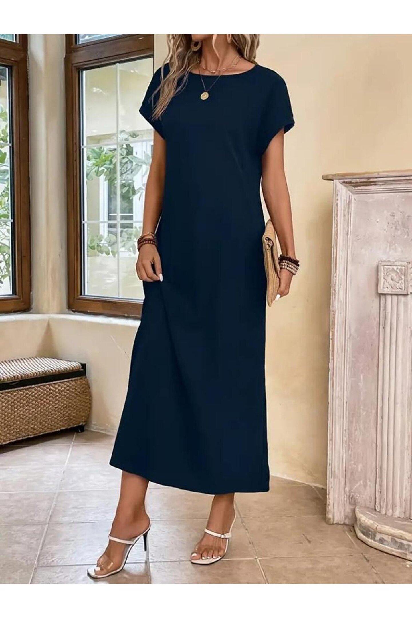 Kadın Uzun Kollu Yakası Açık Viskon Elbise
