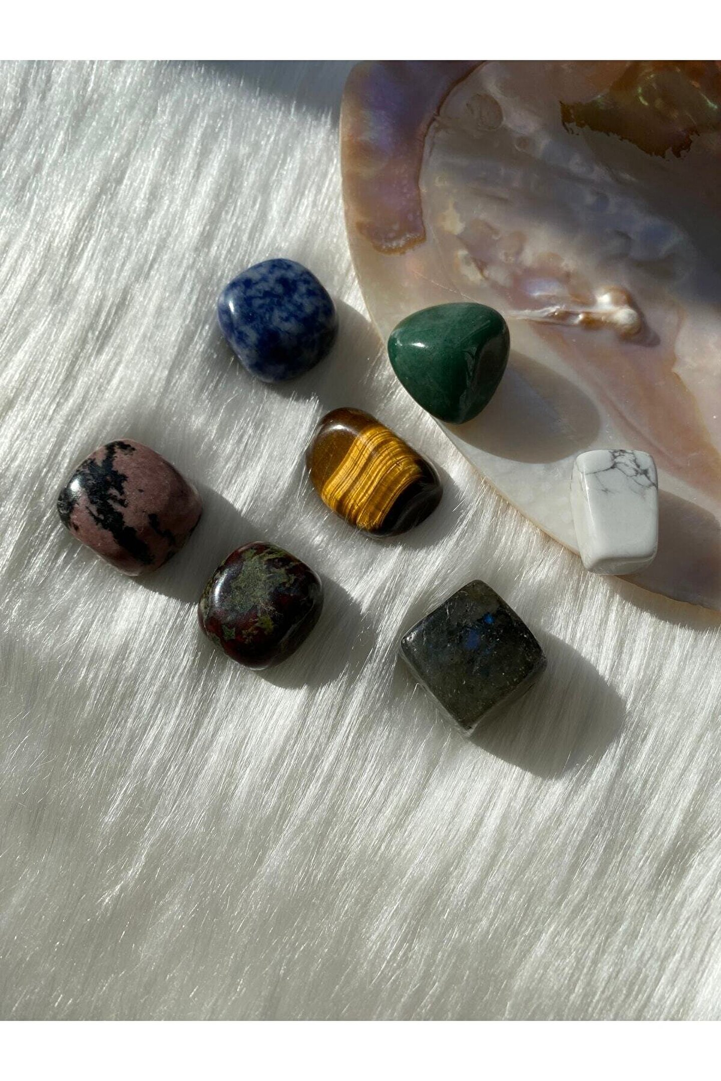 Setin içerisinde 7 adet tamburlanmış doğal taş bulunmaktadır. Fotoğraf temsilidir. Doğal taş olduğundan renklerde ve boyutlarında değişiklik gösterebilir. Setin içerisinde bulunan taşlar ; Kan taşı, Labradorit, Rodonit, Mavi Aventurin, Havlit, Aventurin ve Kaplan gözü bulunmaktadır. Alt çakralar, fiziksel benlik ve hayatta kalma ile ilişkili temel içgüdüleri yönetir. Yüksek çakralar ise düşünce ve bilinçle bağlantılı zihinsel özellikleri ve duyguları kontrol eder. Alt ve üst çakraları birbirine bağlayan ve hem fiziksel hem de duygusal yönleri birbirine bağlayan kalptir.